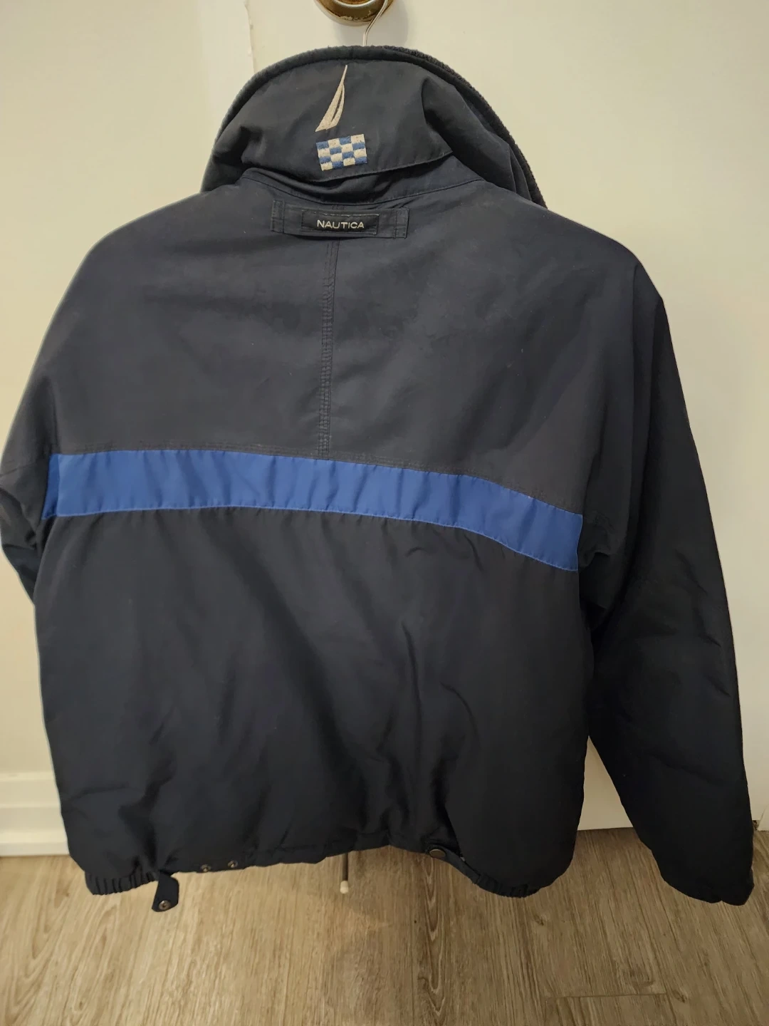 Selling a Nautica navy blue puffer jacket. It features a ribbed collar and a blue stripe across the back. The jacket has the Nautica logo on the upper back and flags on the sleeve. It's a great jacket for staying warm!
