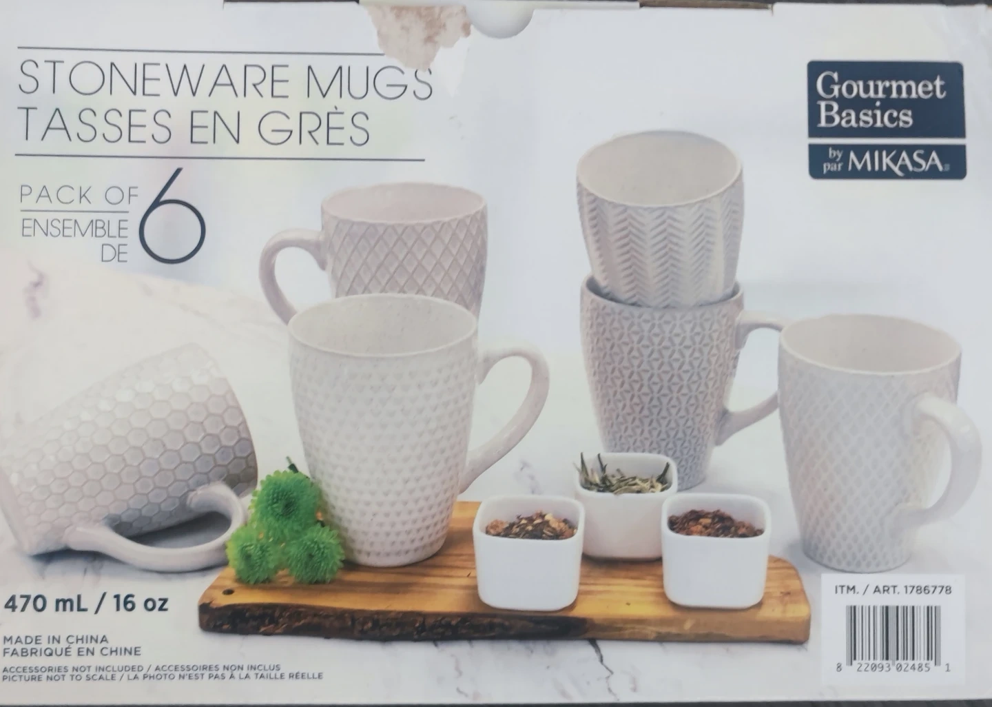 Selling a set of 6 Mikasa Gourmet Basics stoneware mugs! These mugs are 470 mL / 16 oz each and come in a pack of 6. They feature a lovely textured design. Perfect for enjoying your favourite hot beverages!