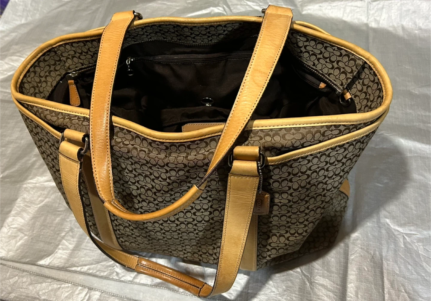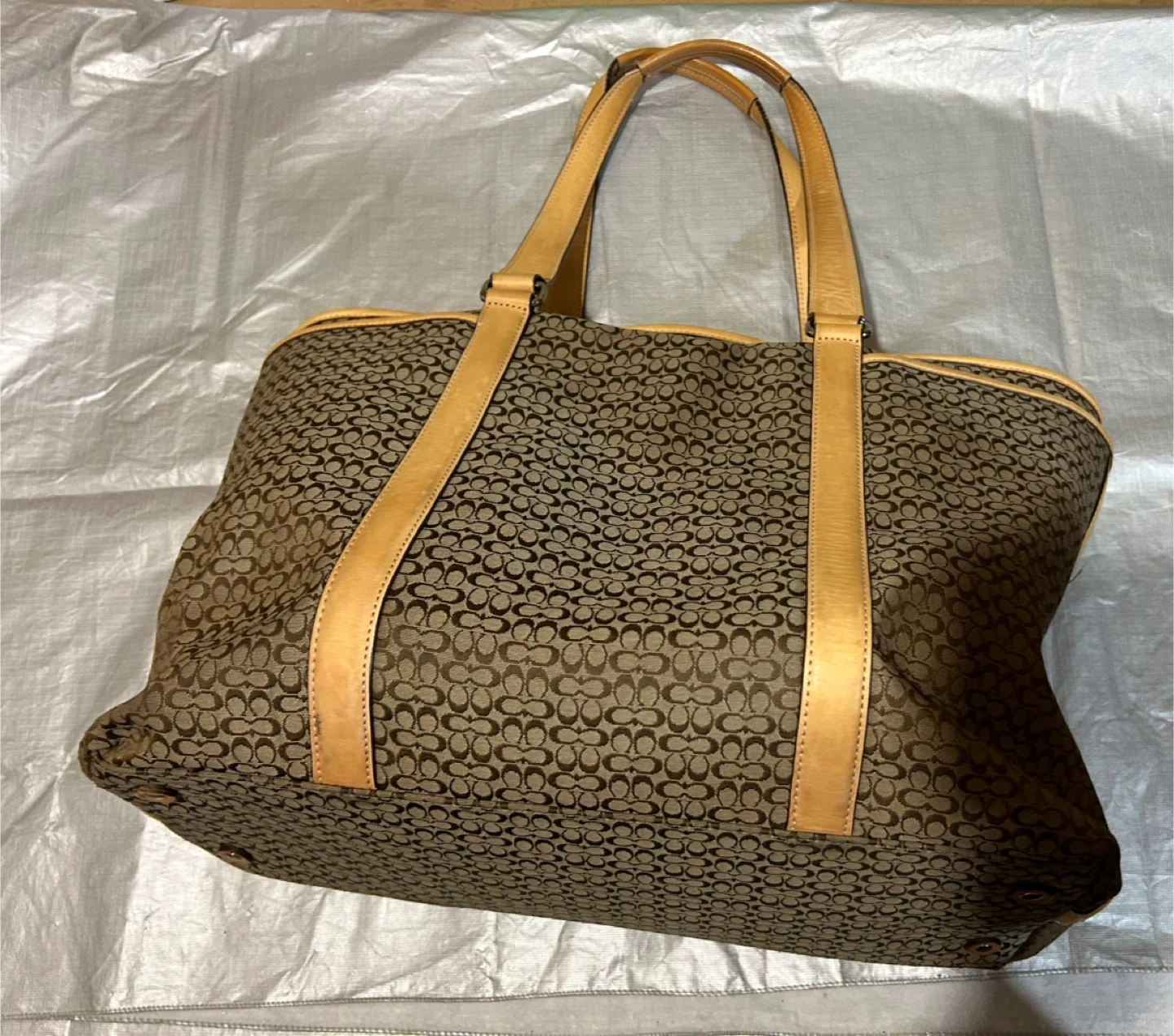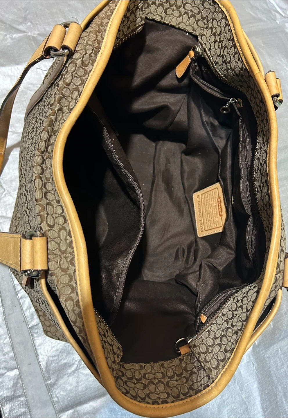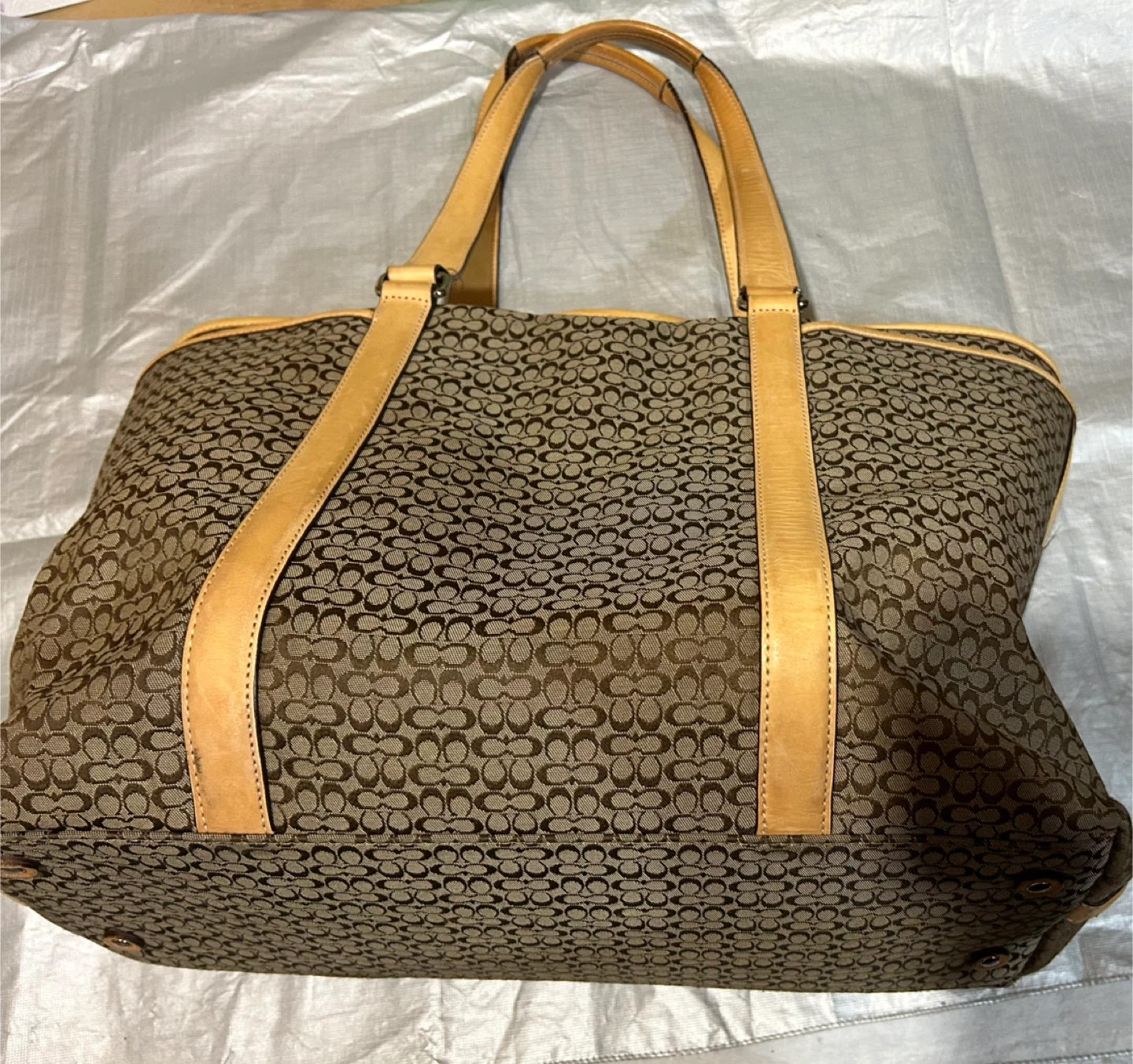 Selling a Coach tote bag featuring the classic signature print. It's a stylish and functional bag, perfect for everyday use. The bag has leather straps and trim, adding a touch of luxury to its design. It's in good condition and ready for a new owner!