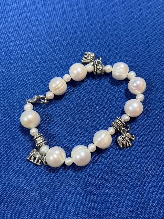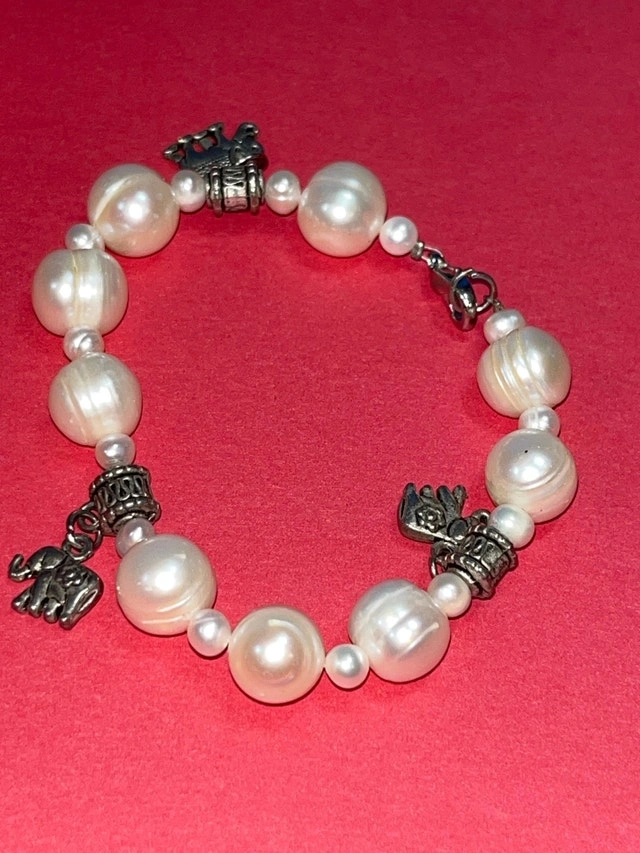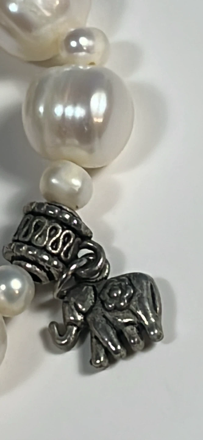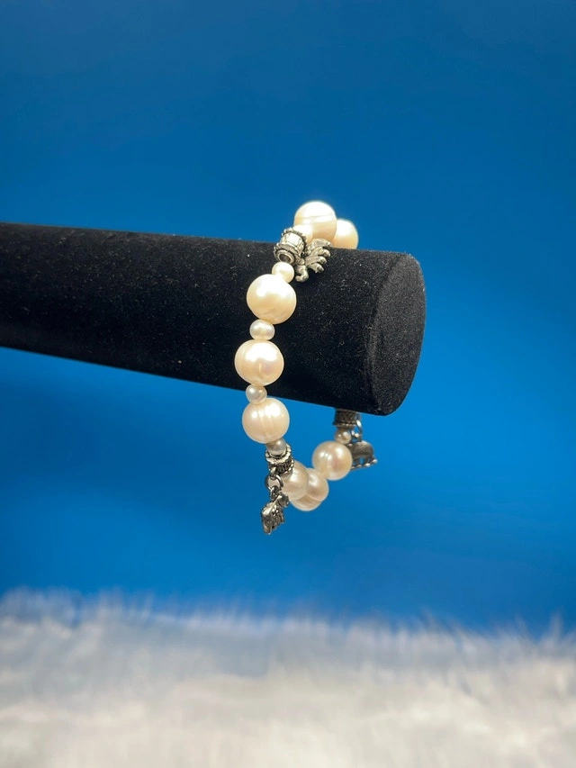 Adorn your wrist with this elegant pearl bracelet, featuring luminous, round pearls interspersed with intricately designed metal accents and playful charms. This bracelet is in used condition, showing gentle signs of wear that add to its unique character. Specifications: - Pearl Type: Cultured Pearls - Clasp Type: Lobster Claw - Charm Details: Elephant, Clover - Metal: Alloy Add a touch of whimsy and sophistication to any outfit! Don't miss the chance to make it yours. Remember, if you're reading this, it's still available!