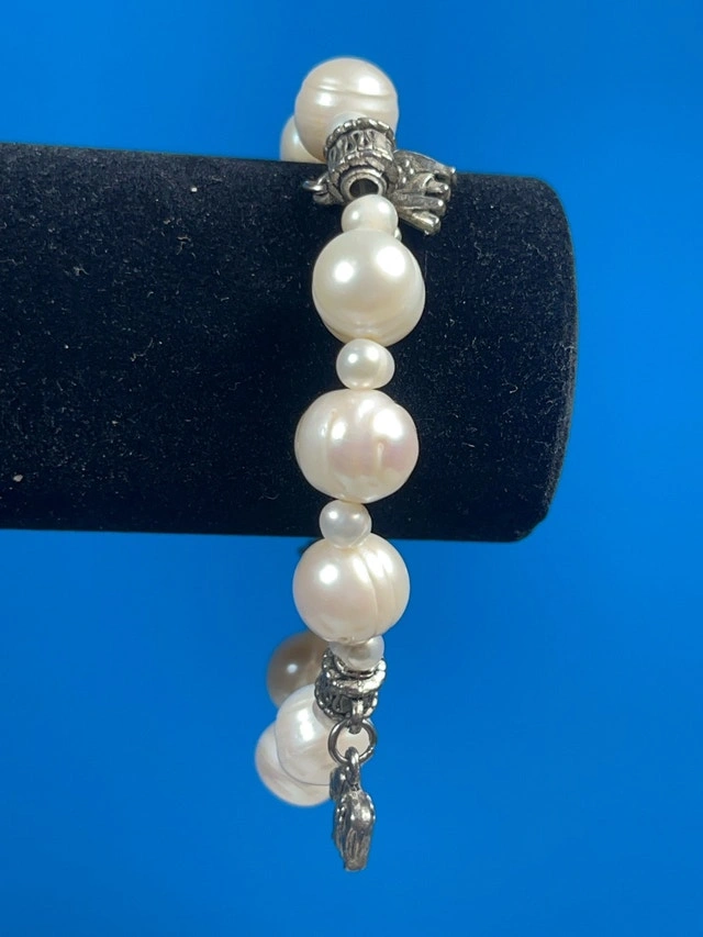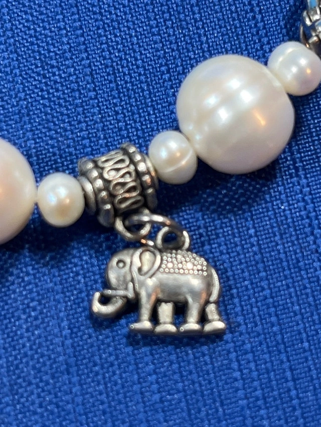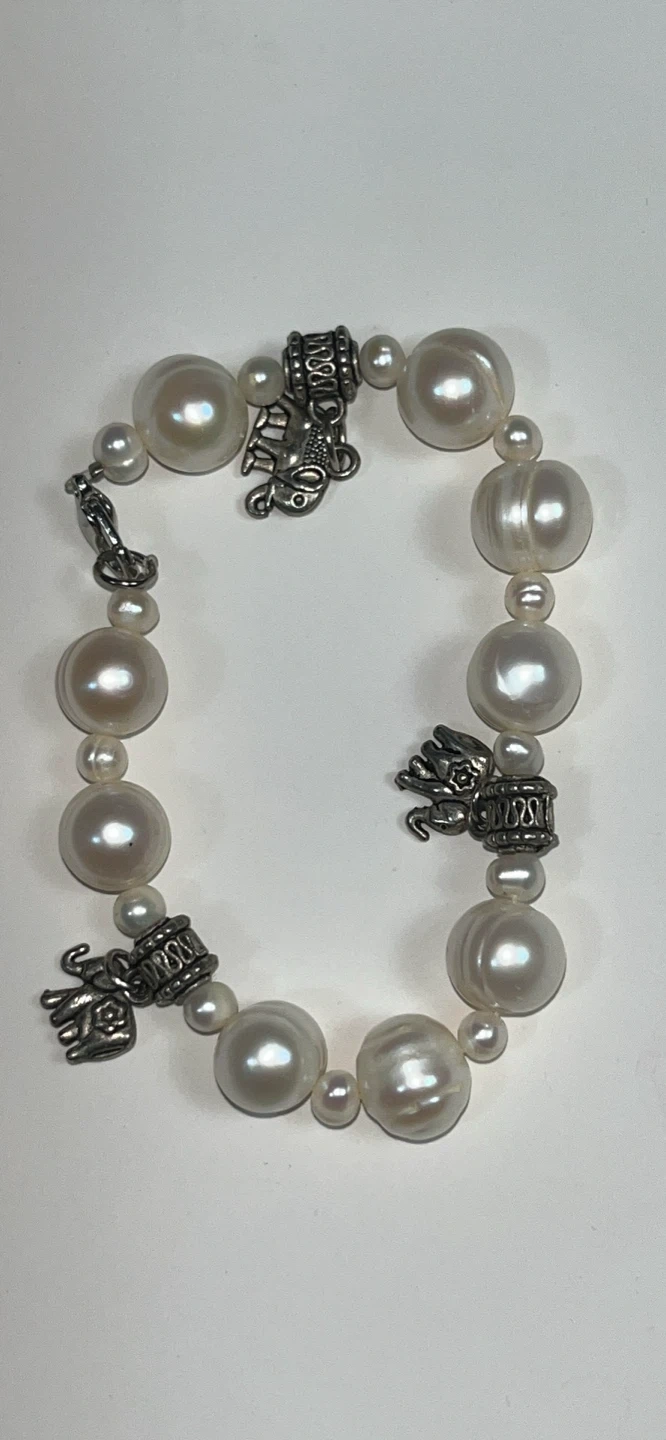 Adorn your wrist with this elegant pearl bracelet, featuring luminous, round pearls interspersed with intricately designed metal accents and playful charms. This bracelet is in used condition, showing gentle signs of wear that add to its unique character. Specifications: - Pearl Type: Cultured Pearls - Clasp Type: Lobster Claw - Charm Details: Elephant, Clover - Metal: Alloy Add a touch of whimsy and sophistication to any outfit! Don't miss the chance to make it yours. Remember, if you're reading this, it's still available!