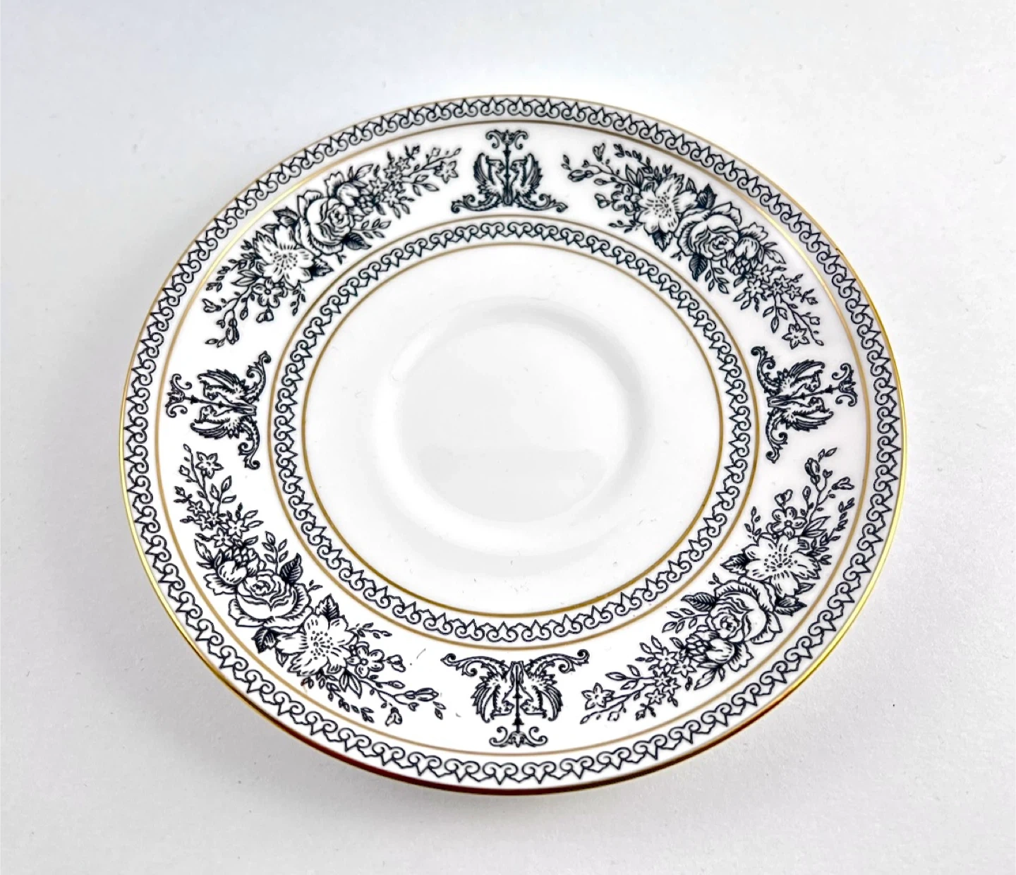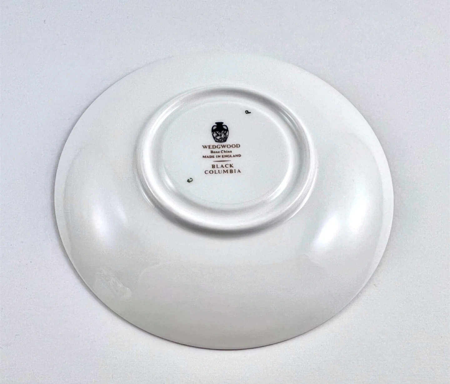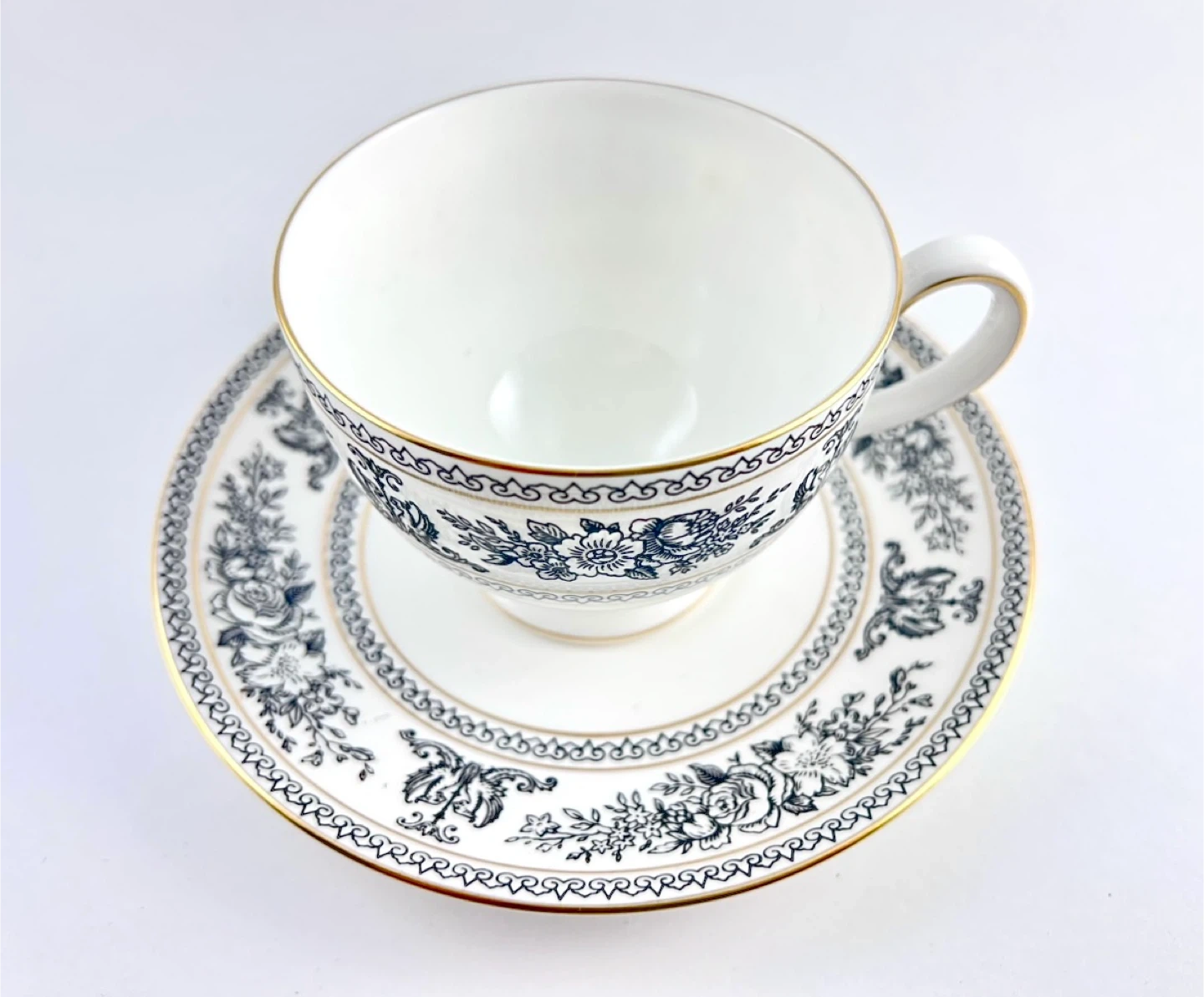 Wedgwood Black Columbia (discontinued) teacup— no chips, cracks, crazing or gold loss. Both pieces ring/ping