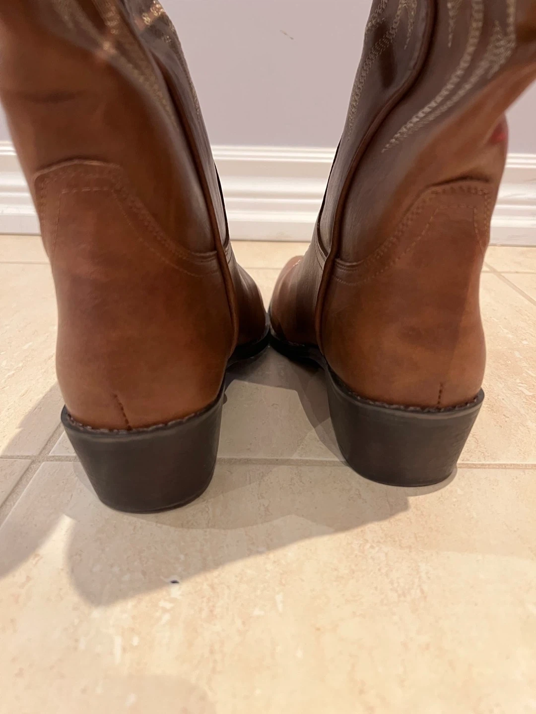 Selling a pair of brown cowboy boots in great condition! They're a size 9 and have a classic western design with decorative stitching. Perfect for adding a bit of flair to your outfit!