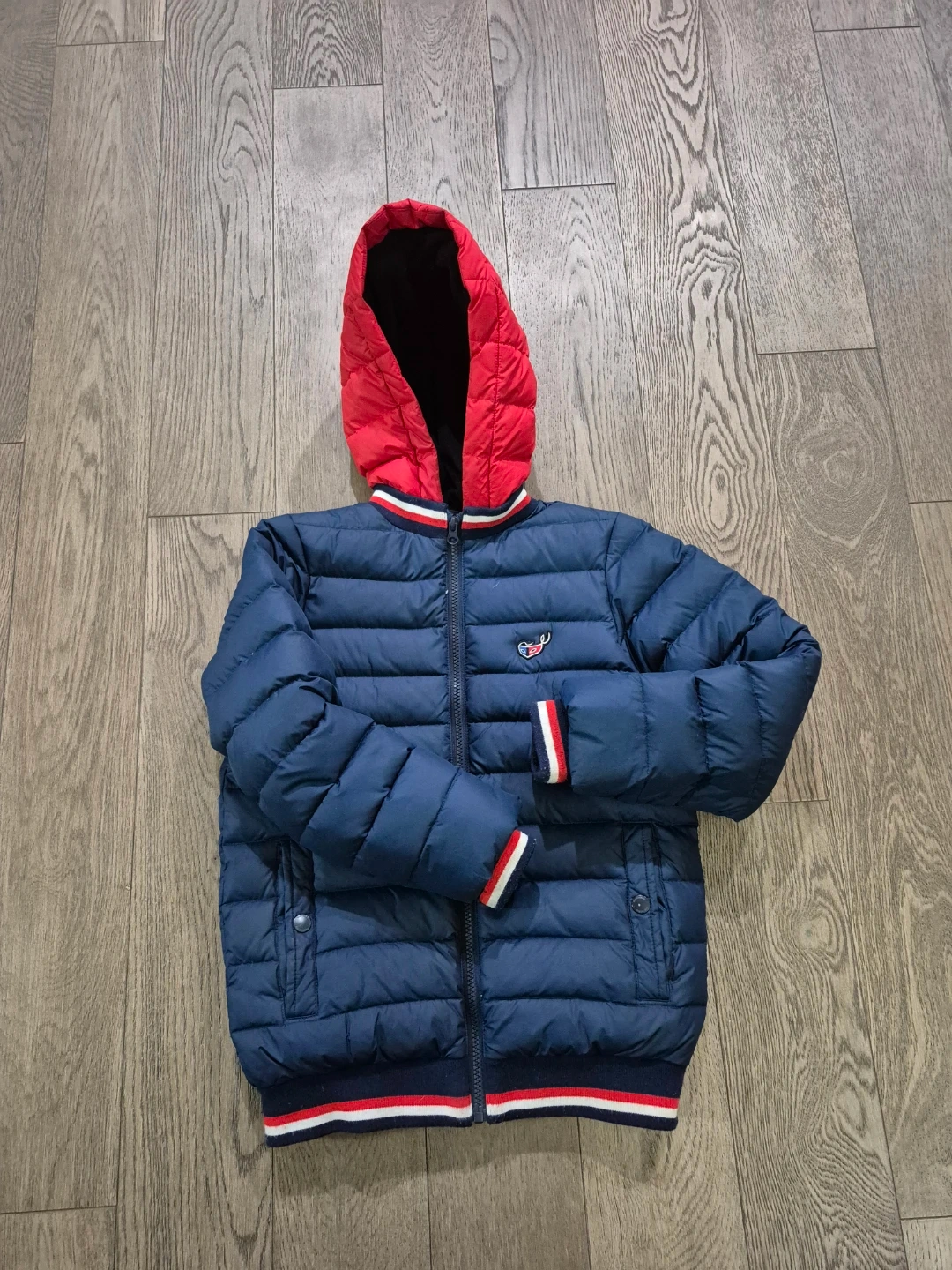 puffer jacket in great condition! It's a stylish blue with red accents on the hood and cuffs. Perfect for staying warm this season! Boy's size 8