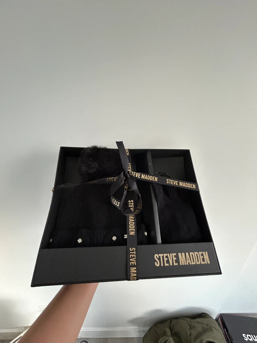 Selling a brand new Steve Madden hat and gloves set! It comes in the original box, perfect for gifting or keeping yourself cozy. The set is black and features a stylish design. Originally bought for $24.98