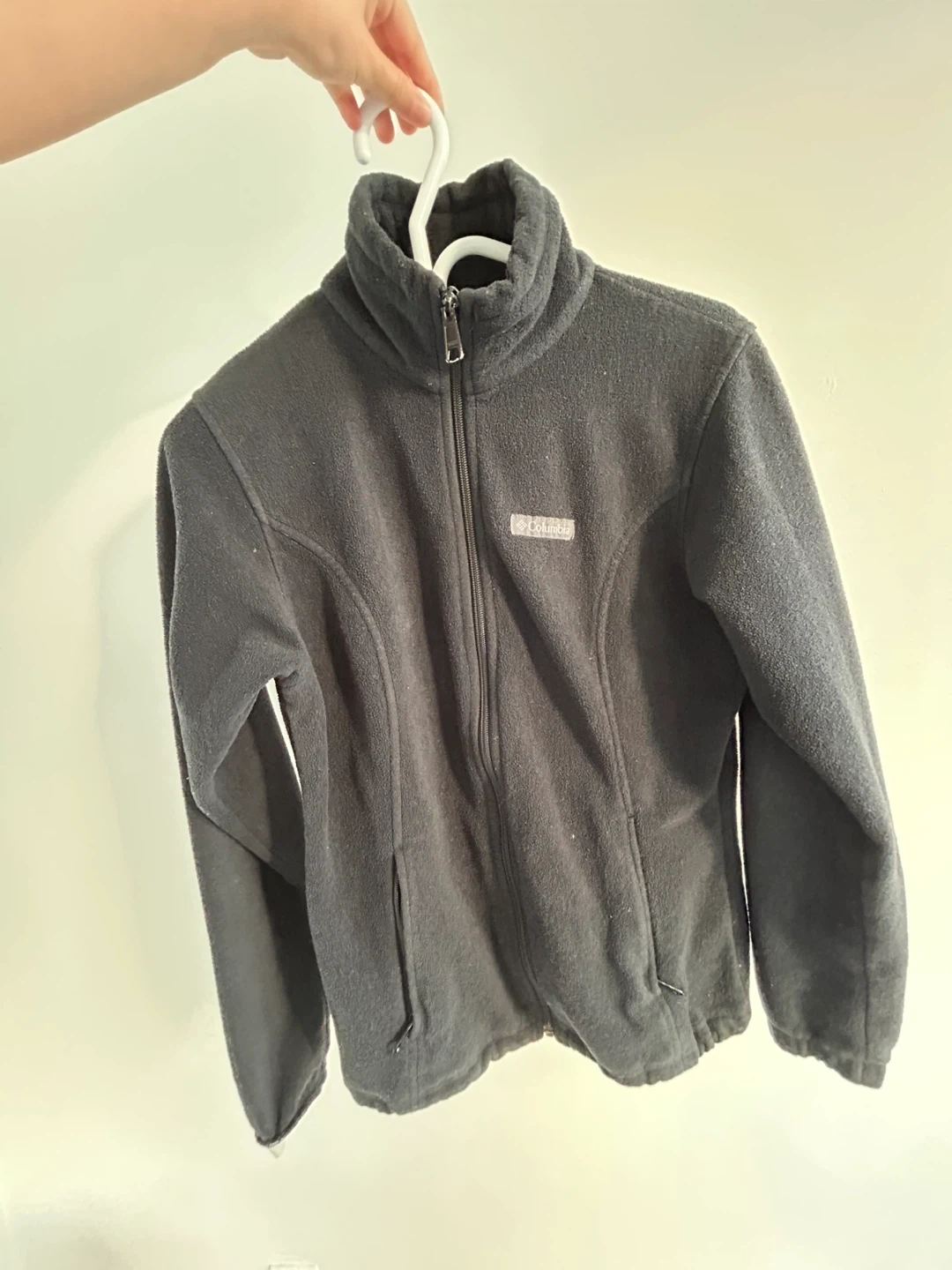 Here's a comfy black fleece jacket from Columbia! It's perfect for layering or wearing on its own during milder weather. It's in great condition and ready for a new owner!