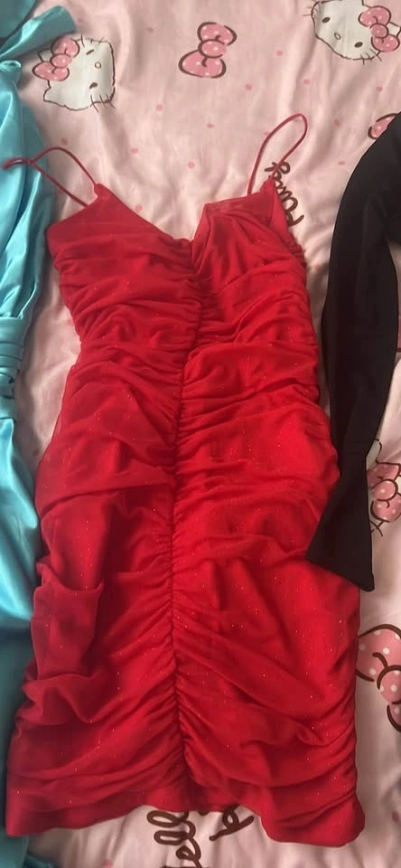All 3 dresses have been worn once, and they're all stretchy. I'm selling them because I have nowhere to wear them.