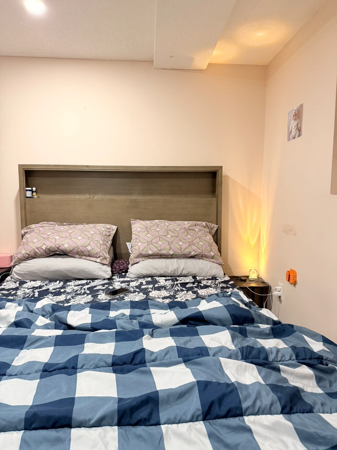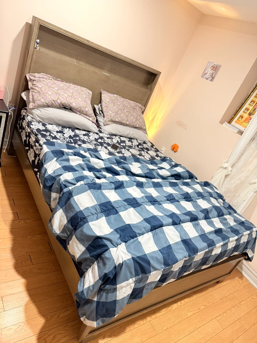 Selling a queen size bed with a headboard. It's in good condition and ready for a new home. The bed features a stylish headboard with built-in storage, perfect for keeping your nighttime essentials close at hand. The bed frame is sturdy and provides excellent support for a comfortable night's sleep