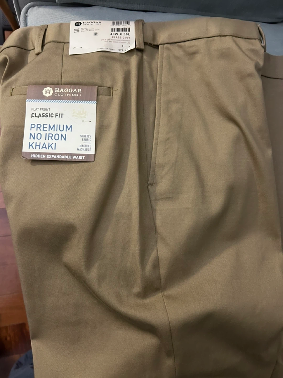 BRAND-NEW pair of men’s Haggar Classic Fit khaki pants. These are a size 40W x 30L. Hubby needed longer leg length. They are premium no-iron and made with stretch fabric. They also feature a hidden expandable waist and are machine washable. Suggested retail price is $70.