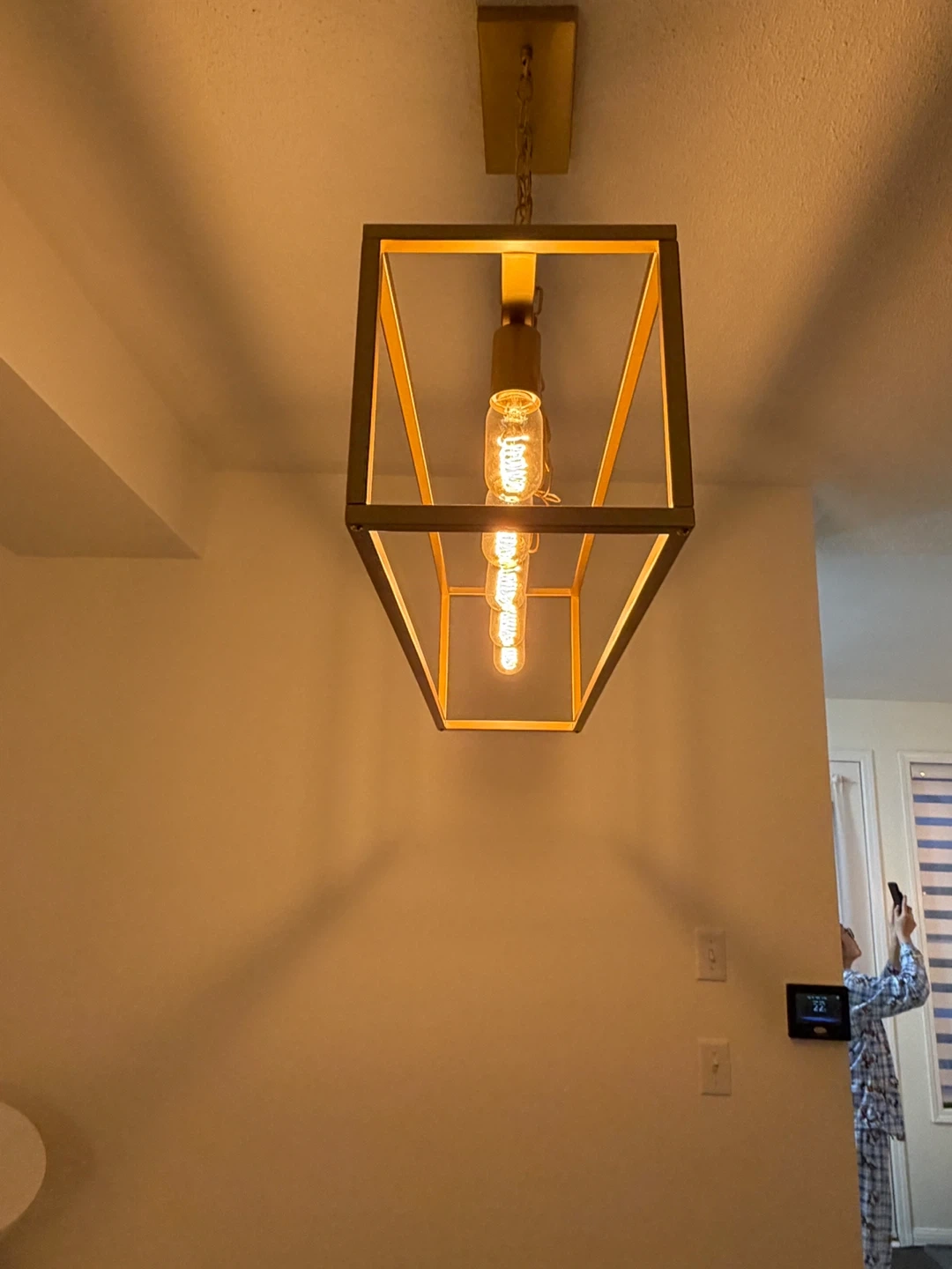 Selling a beautiful gold rectangular farmhouse chandelier! It's in great condition and would look lovely in a dining room or kitchen. It has a modern farmhouse aesthetic that adds a touch of elegance to any space. The rectangular design and gold finish make it a stylish lighting fixture. The chain extends further down but we just tied it up out of the way while moving.