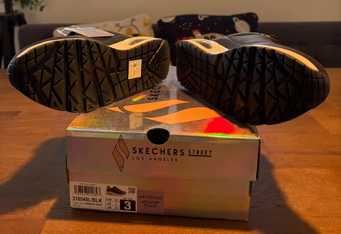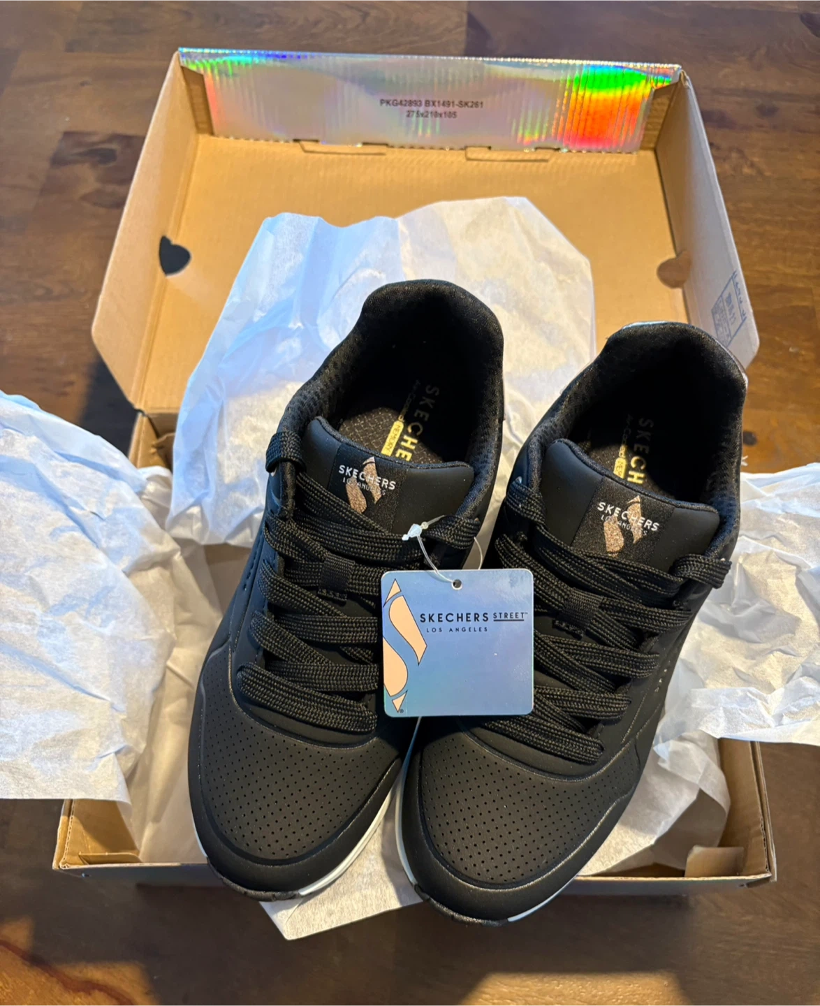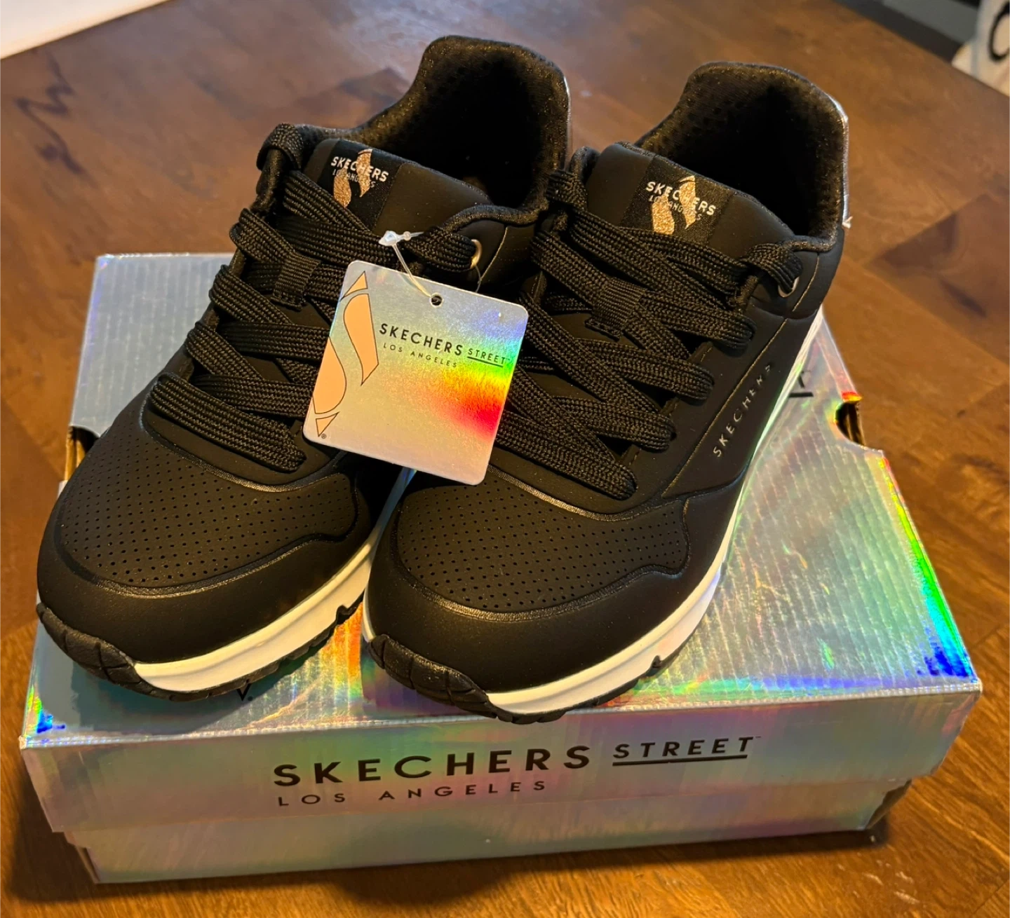 These are a pair of brand new Skechers Street Uno Gen1 Shimmer Away sneakers for kids in a size 3! They come with the original box. These sneakers feature air-cooled memory foam for extra comfort.