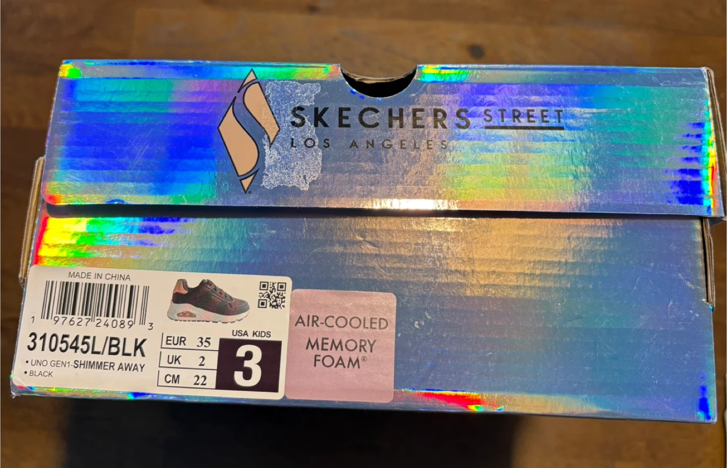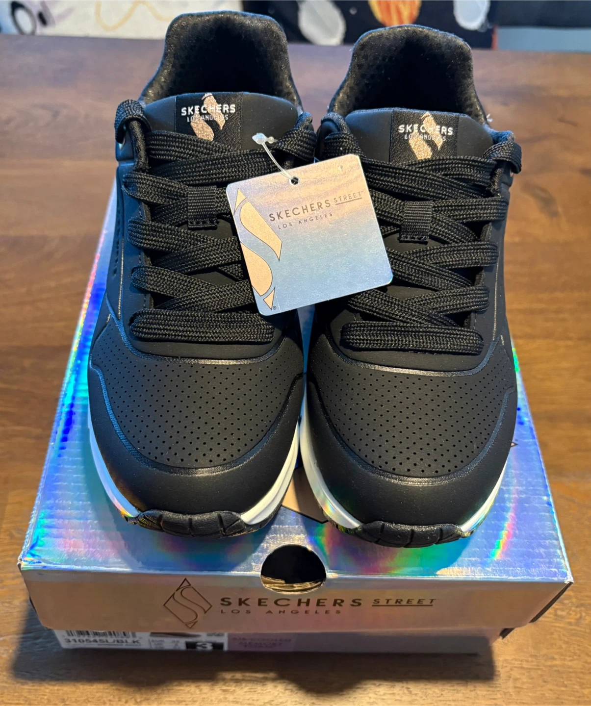 These are a pair of brand new Skechers Street Uno Gen1 Shimmer Away sneakers for kids in a size 3! They come with the original box. These sneakers feature air-cooled memory foam for extra comfort.