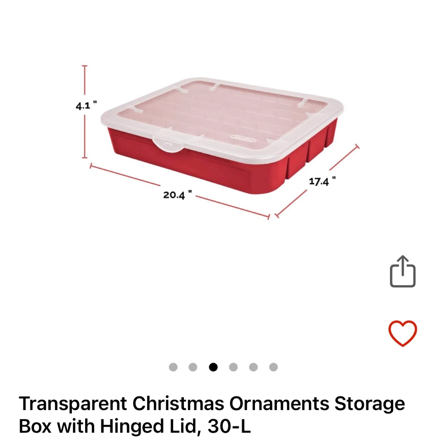 Keep your precious ornaments safe and organized with this Christmas ornaments storage box! It comes with a hinged lid and measures 20.4" x 17.4" x 4.1". Perfect for keeping your holiday decorations in tip-top shape for years to come