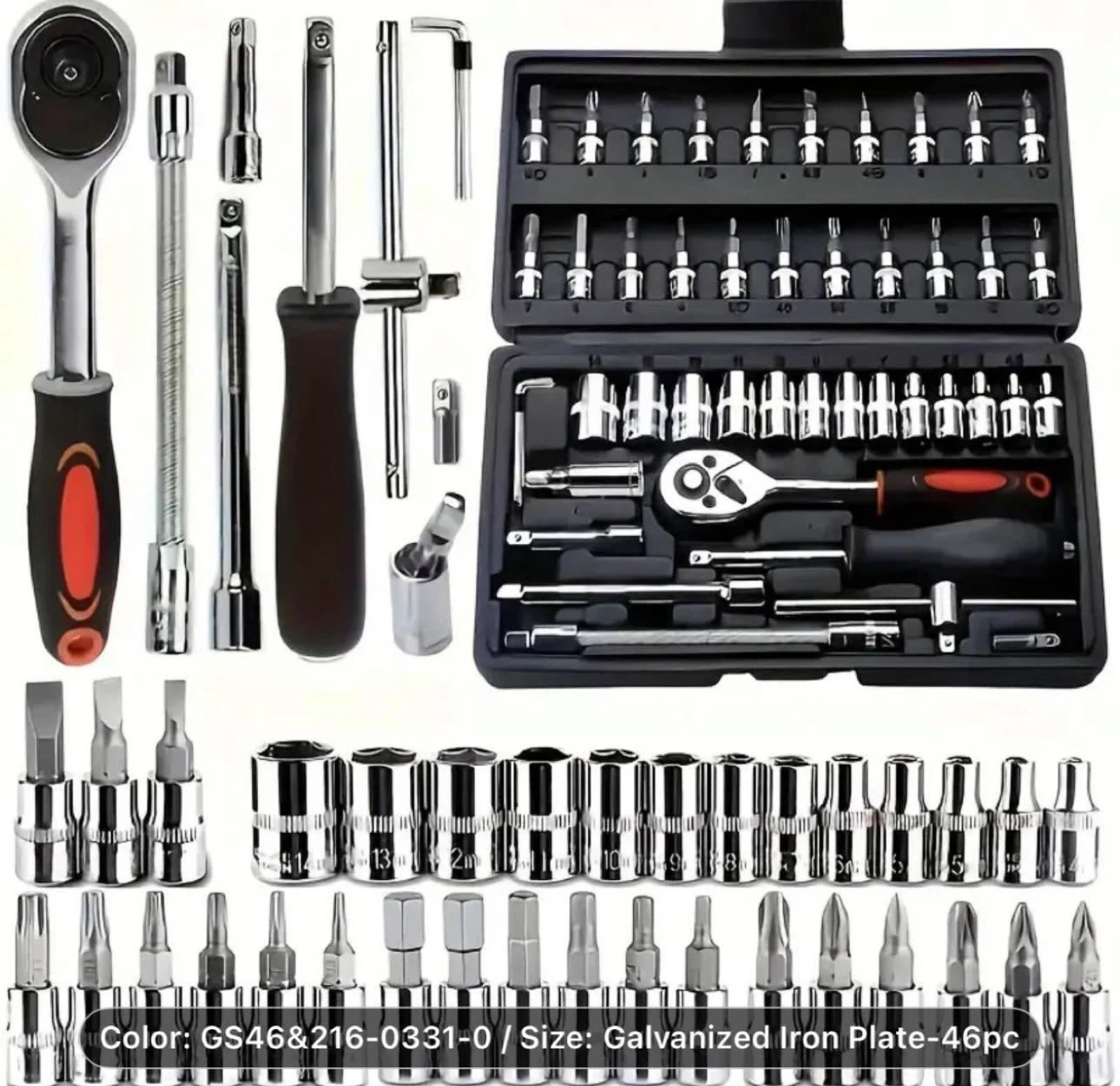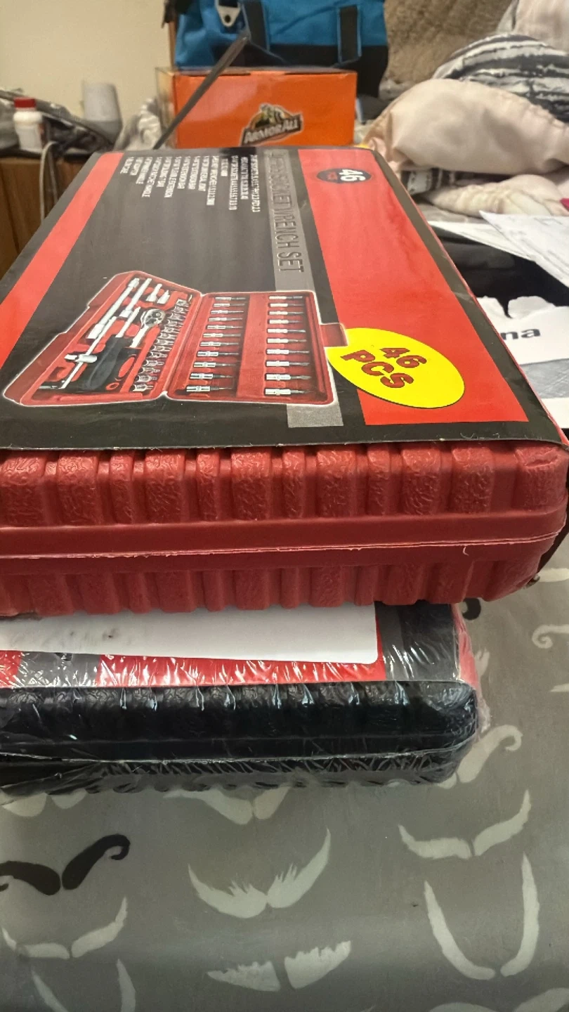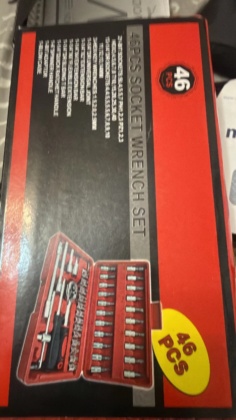 Selling a 46-piece socket wrench set. It includes various sockets, extensions, and adaptors. The set comes in a red case for easy organization and storage