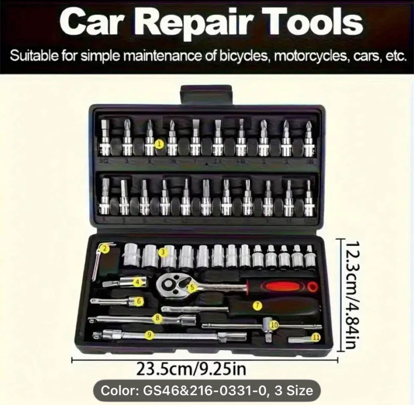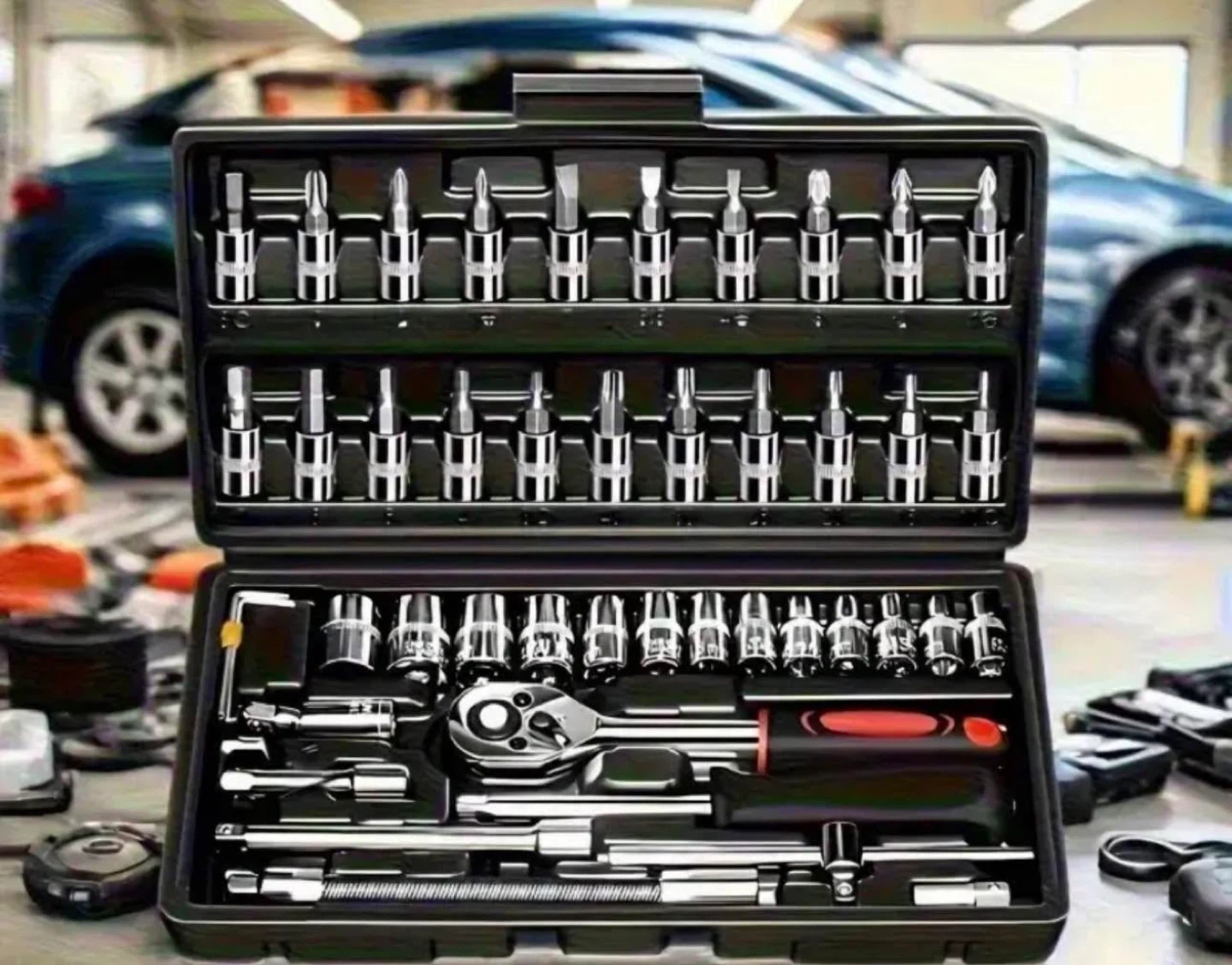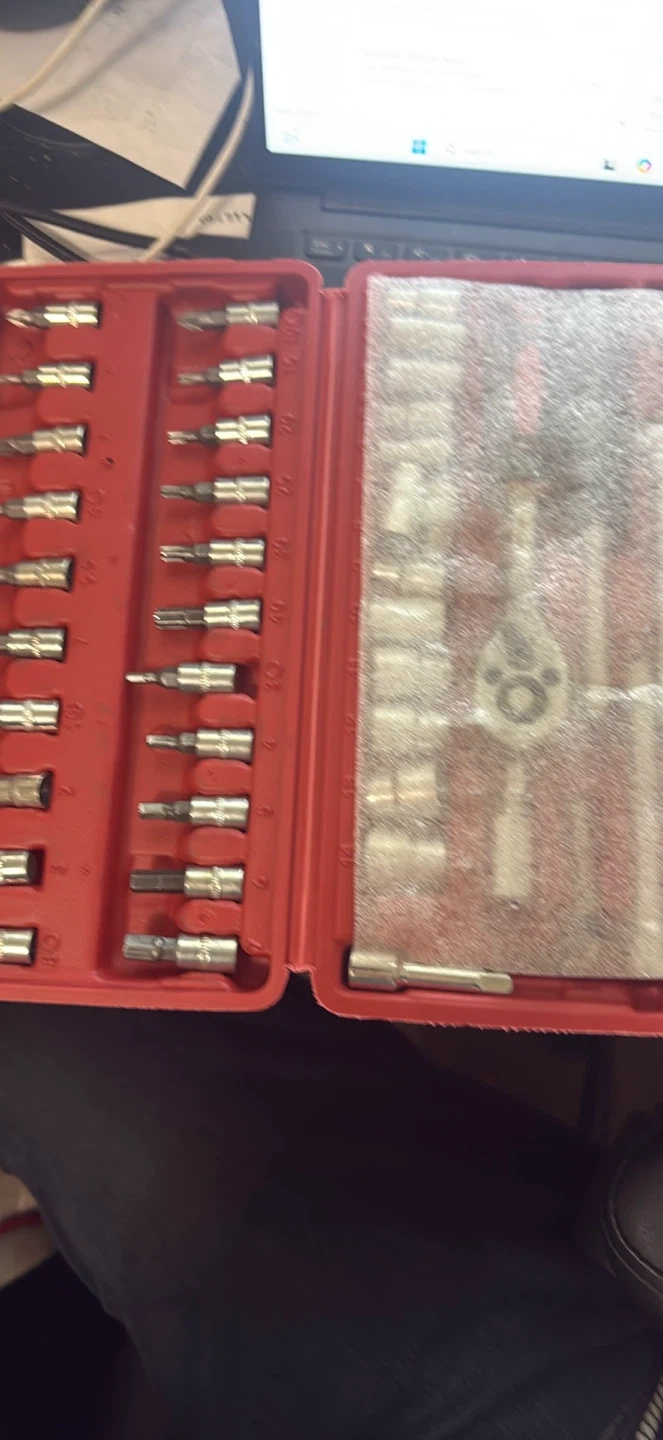Selling a 46-piece socket wrench set. It includes various sockets, extensions, and adaptors. The set comes in a red case for easy organization and storage