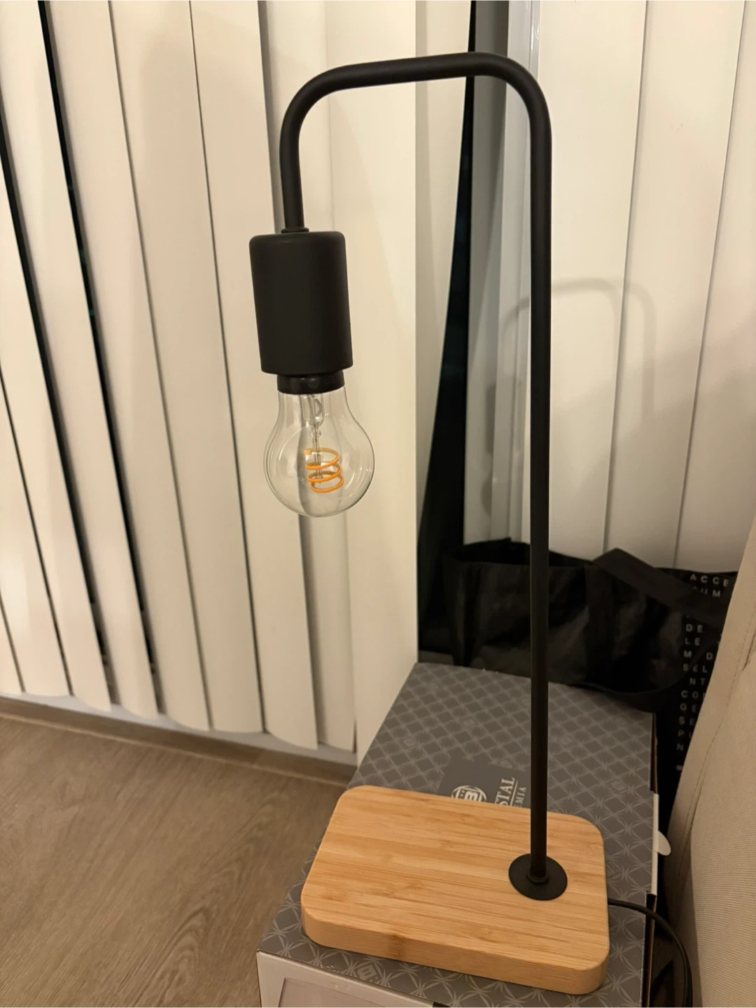 Selling a stylish accent lamp featuring a black metal frame and a natural wood base. It's in great condition and would look perfect on a desk or nightstand! The simple design adds a touch of modern elegance to any room
