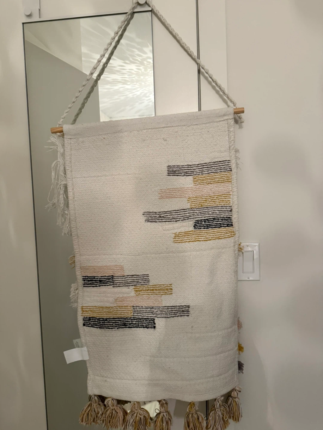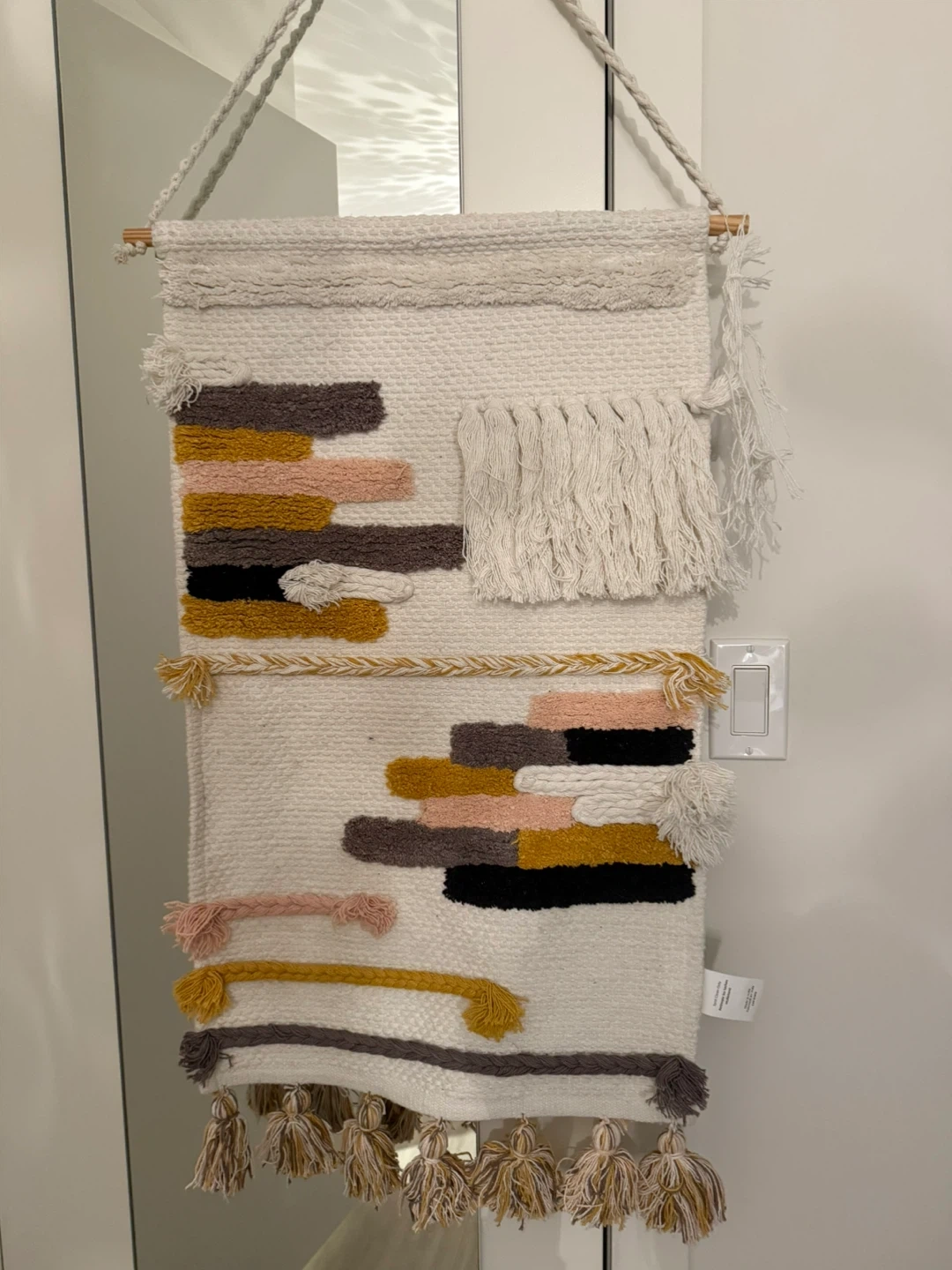 Adding a touch of boho charm to your space! This wall hanging features a lovely textured design with tassels at the bottom. It's perfect for adding a cozy and stylish vibe to any room in your home