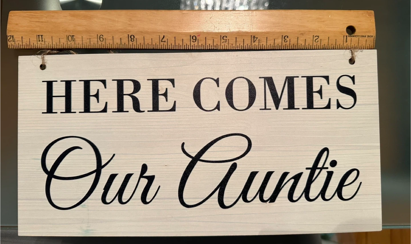 I'm selling a cute sign that says "Here Comes Our Auntie"! It's perfect for a wedding or baby shower. The sign is made of wood and is in great condition. It measures approximately 12 inches in length.
