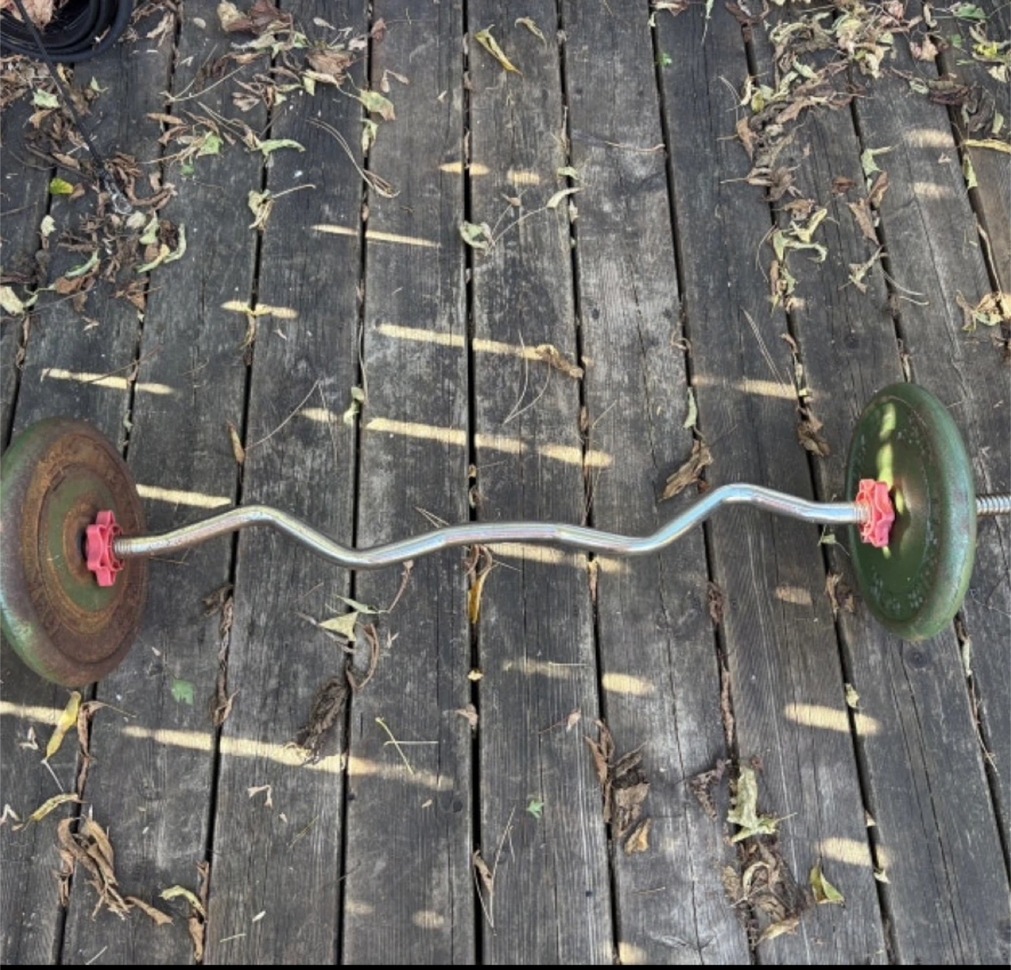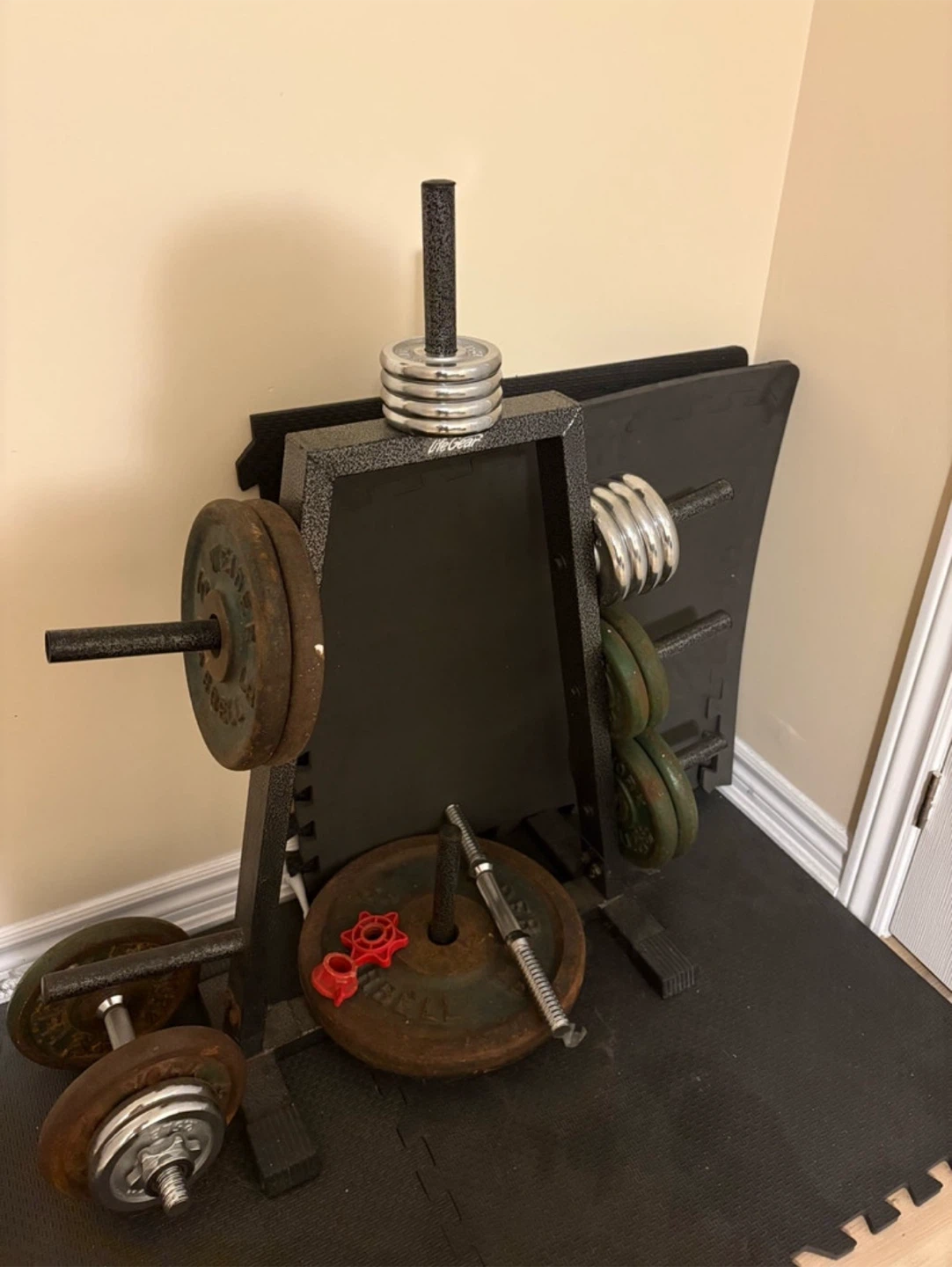 Selling a weight rack and barbell set. It's in used condition but still has plenty of life left. Perfect for setting up a home gym!