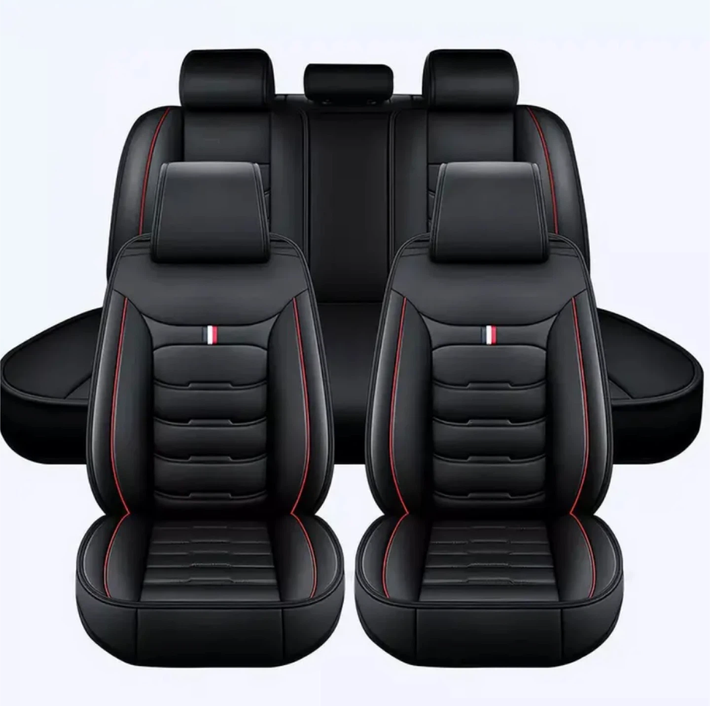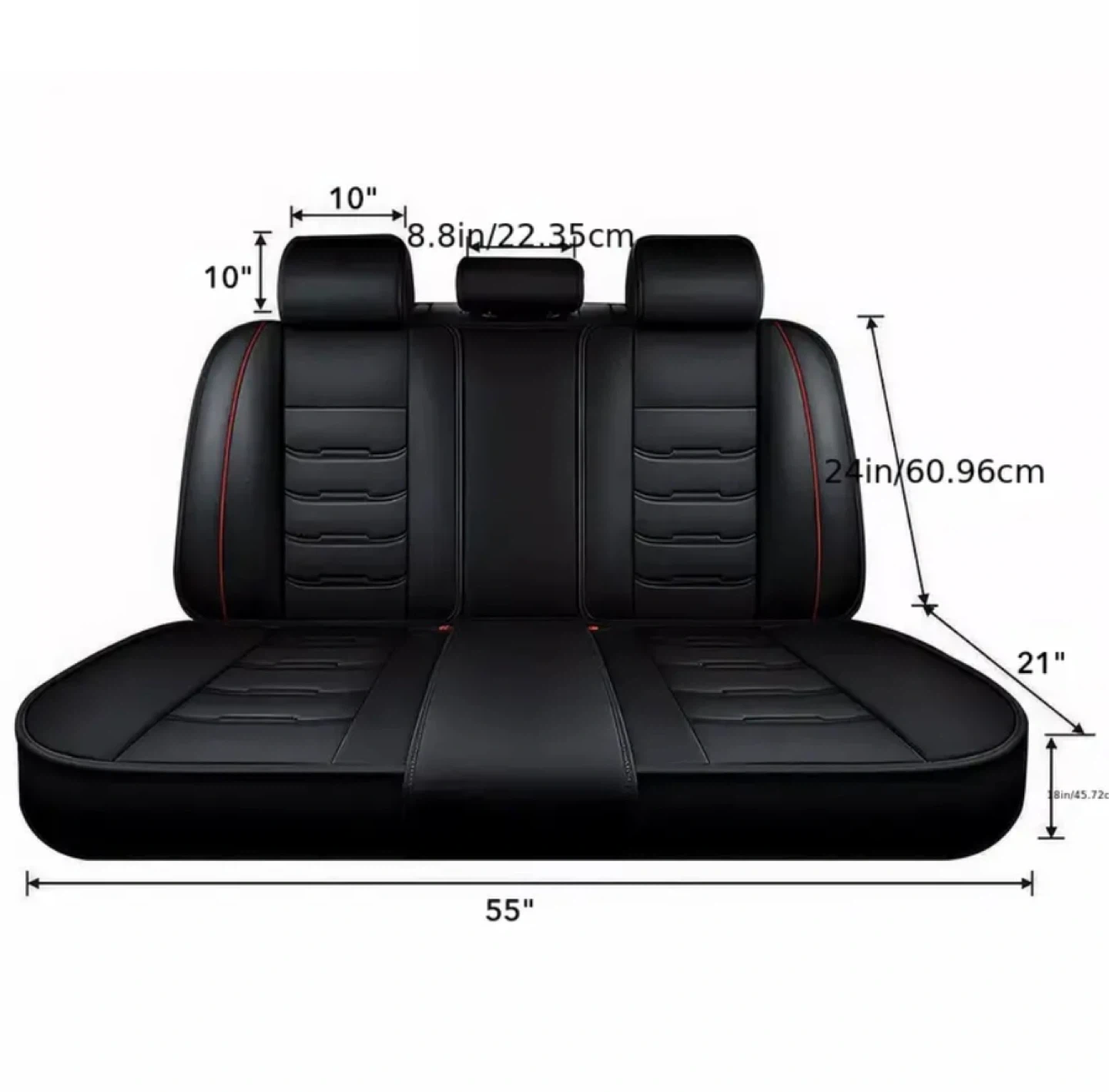 Selling a set of car seat covers in black with red trim. Includes 2 front seat covers, 2 rear bench covers, and 1 rear backrest cover. Dimensions are shown in the pictures, please take a look to see if they'll fit your car!