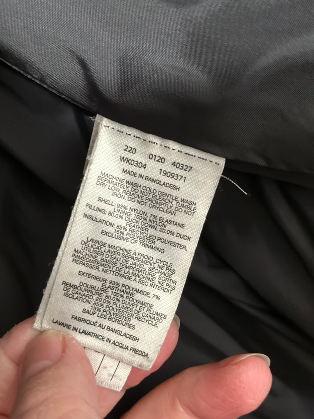Selling a Columbia black down puffer jacket in size small! The shell is made of 93% nylon and 7% elastane. The filling is 80% duck down and 20% duck feathers. The insulation is 85% recycled polyester and 15% polyester