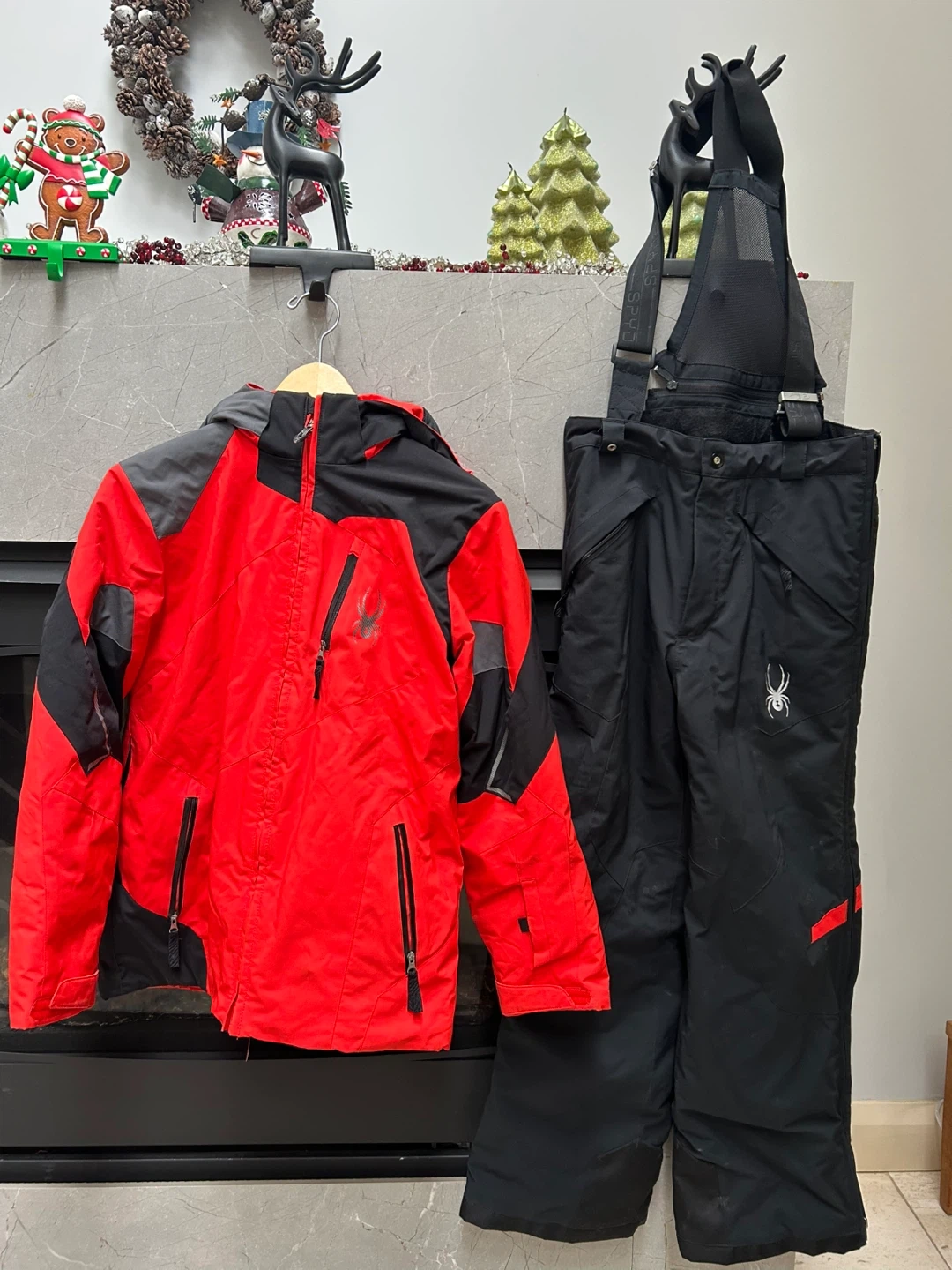Selling a Spyder ski jacket and pants set-size 16/18 kids. The jacket is red and black, and the pants are black. Helmets, goggles, hoodie, boots size 24.5. Perfect for hitting the slopes this winter!