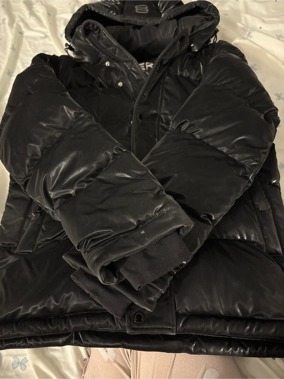 Selling a Super Puff men's puffer jacket in black, size medium. It's in great condition and ready to keep you warm this winter!
