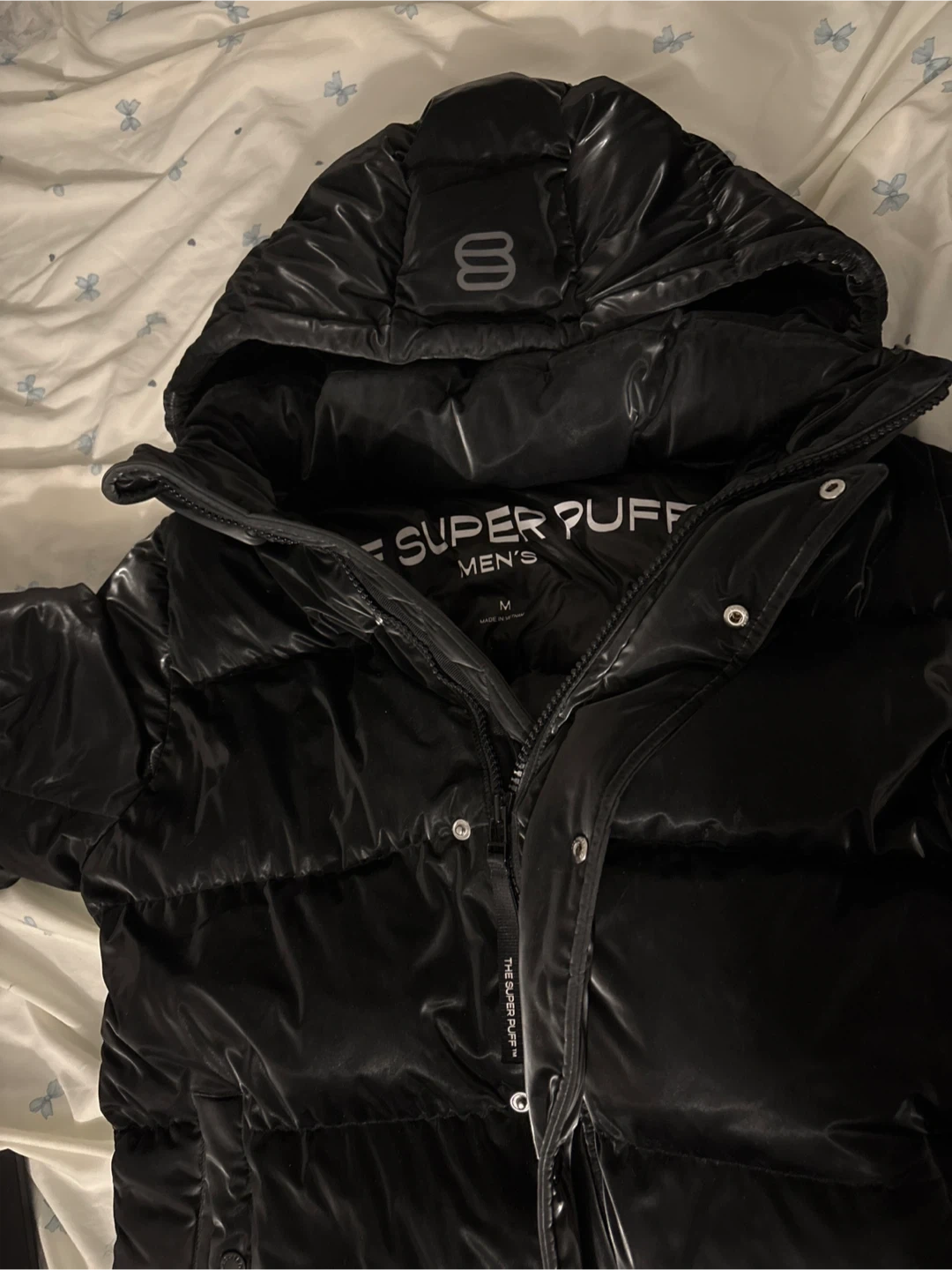 Selling a Super Puff men's puffer jacket in black, size medium. It's in great condition and ready to keep you warm this winter!