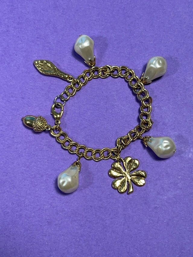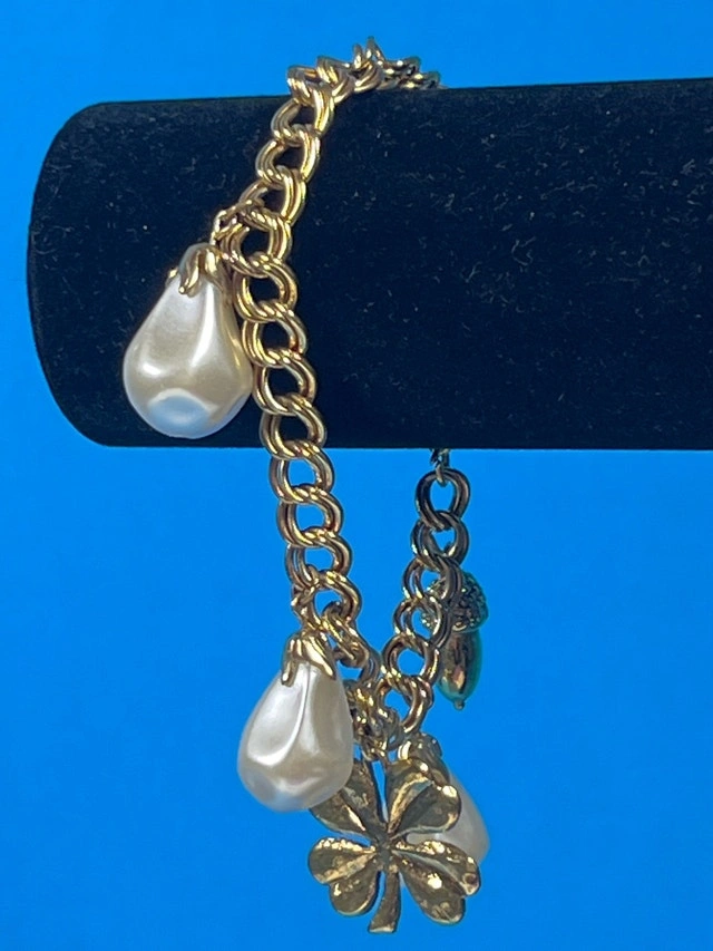 This gold coloured charm bracelet featuring pearl-like charms, a four-leaf clover, and golden charms. It is in good condition, ready to add a touch of whimsy to your wrist. And hey, if the ad's up, it's available!