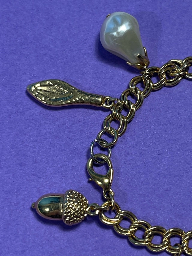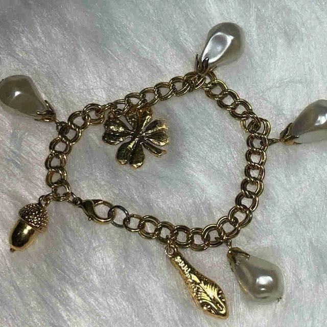 This gold coloured charm bracelet featuring pearl-like charms, a four-leaf clover, and golden charms. It is in good condition, ready to add a touch of whimsy to your wrist. And hey, if the ad's up, it's available!