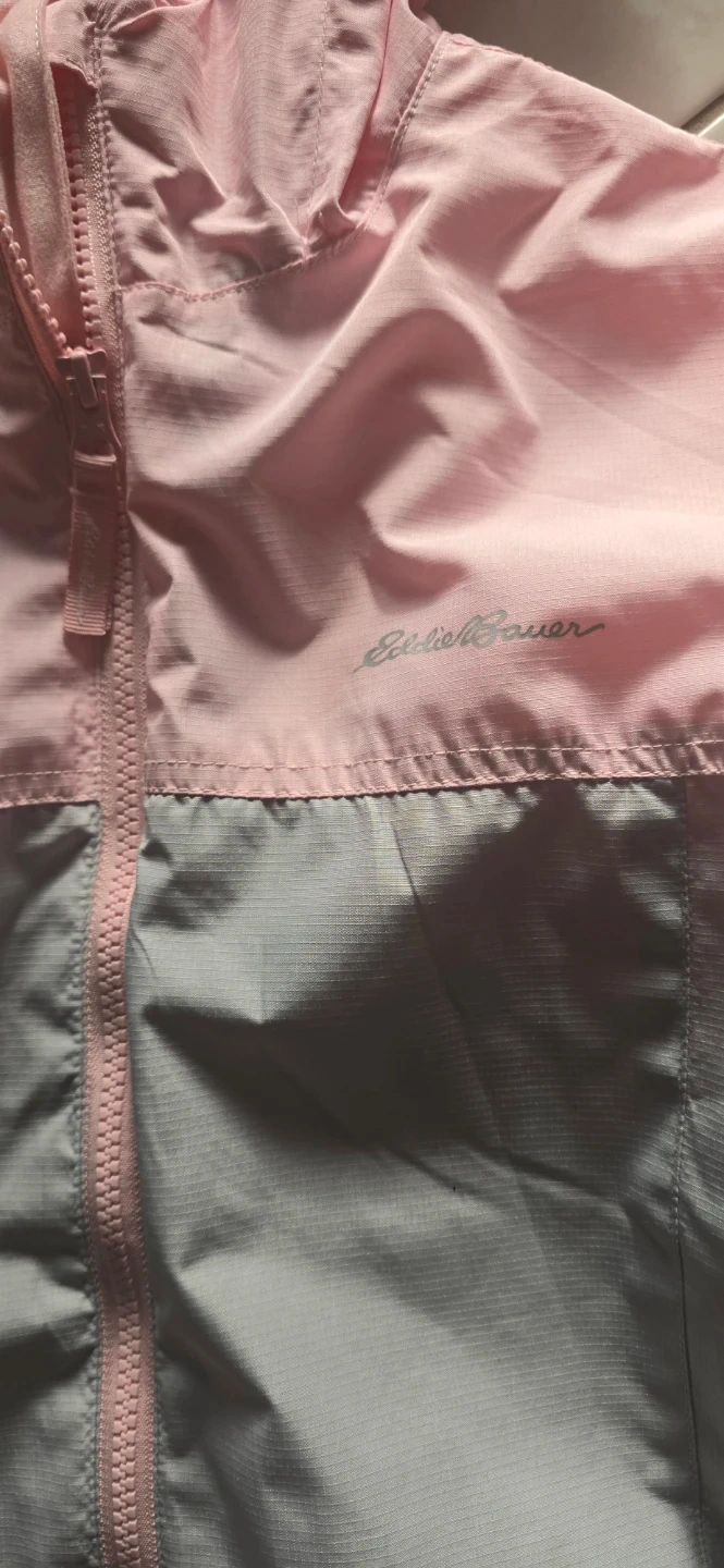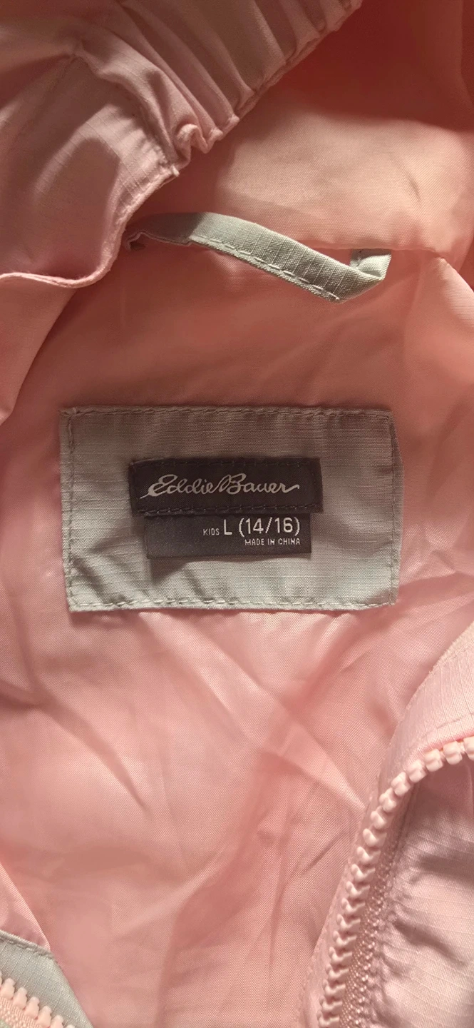 Selling a cute Eddie Bauer kids' jacket in size L (14/16)! It's a stylish pink and grey colour block design, perfect for layering. Great for those in-between weather days!