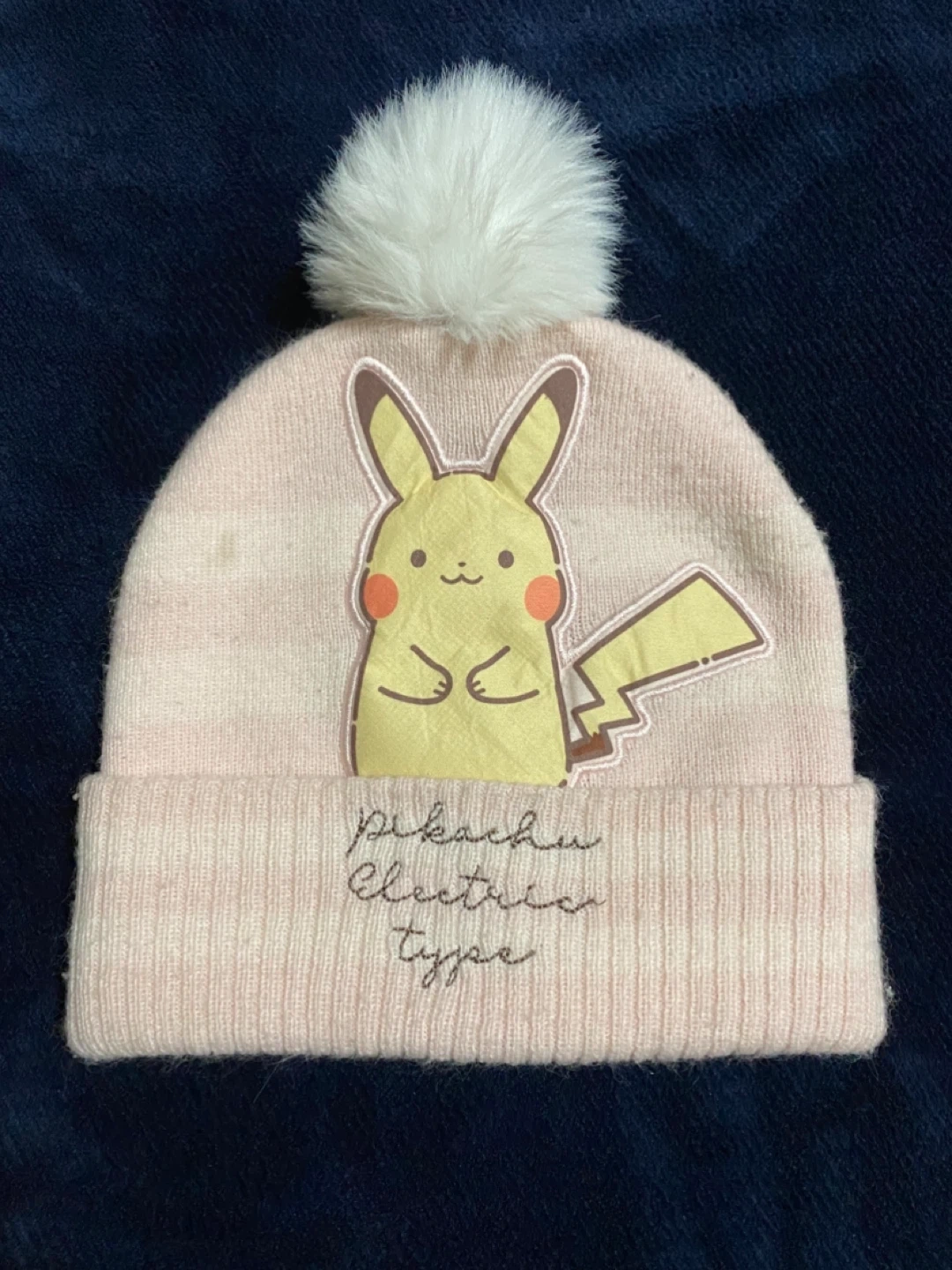 Selling a super cute Pikachu 'electric type' beanie to keep you warm this winter! It's a light pink colour with a fluffy white pompom on top. The front features an adorable Pikachu design and embroidery below!
