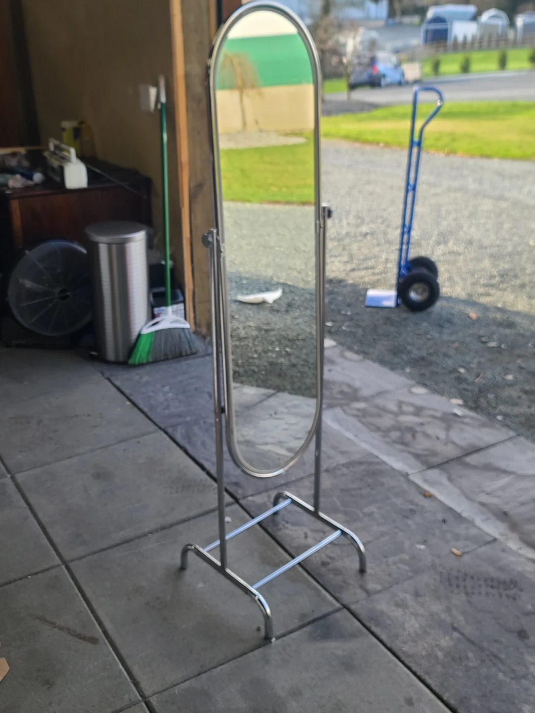 Standing oval mirror with a chrome finish. It's in great shape and ready to brighten up any room! The mirror has a sleek, modern look that would fit well in a variety of spaces. Delivery can be arranged. Viewing and pickup by appointment.
