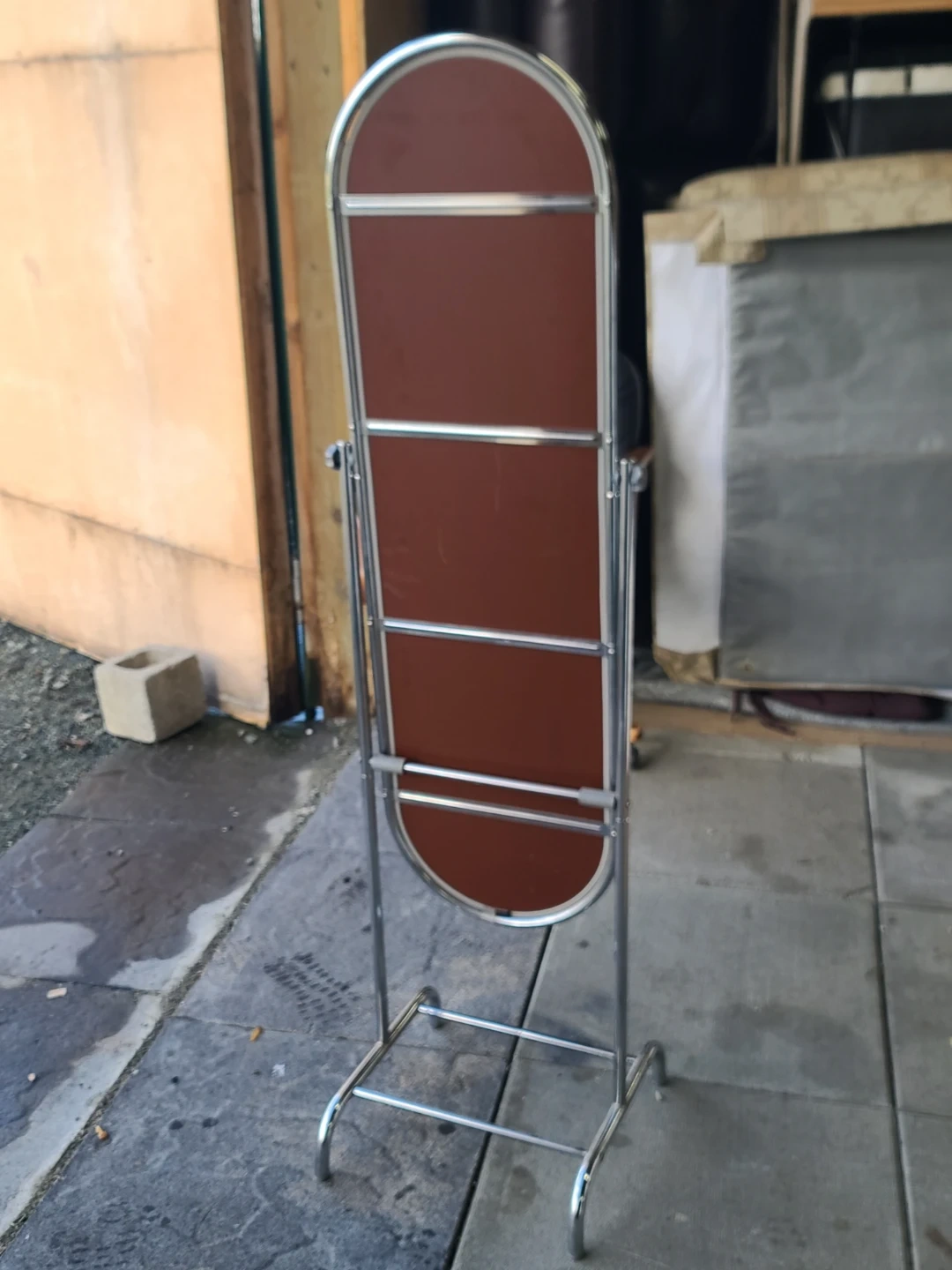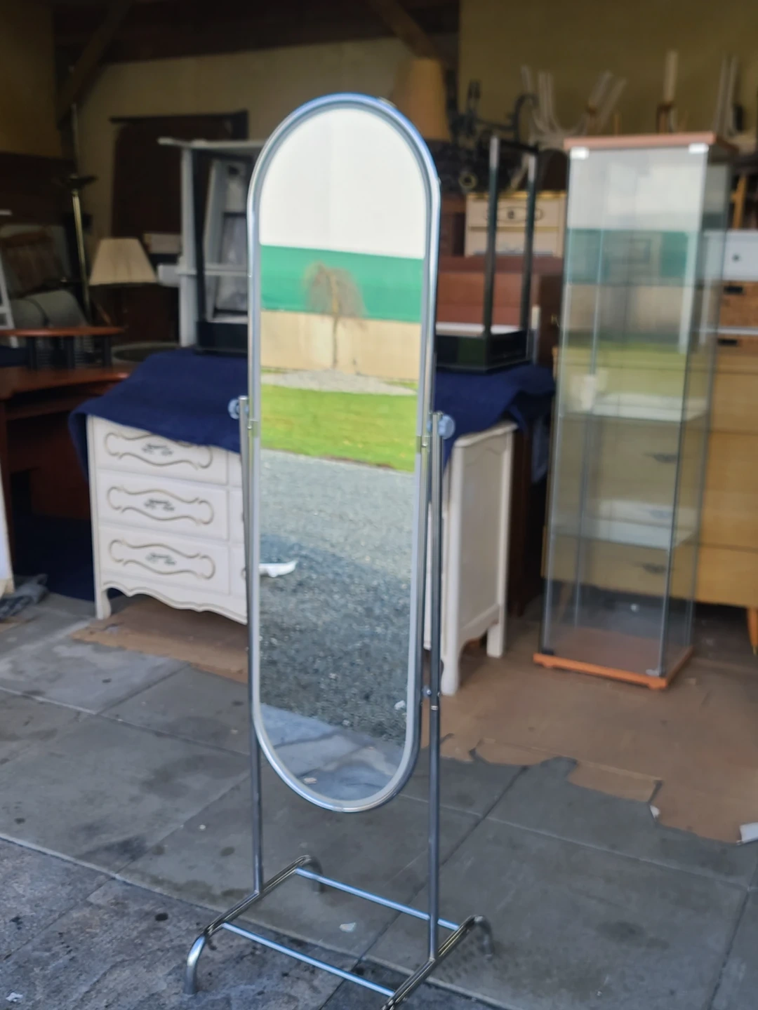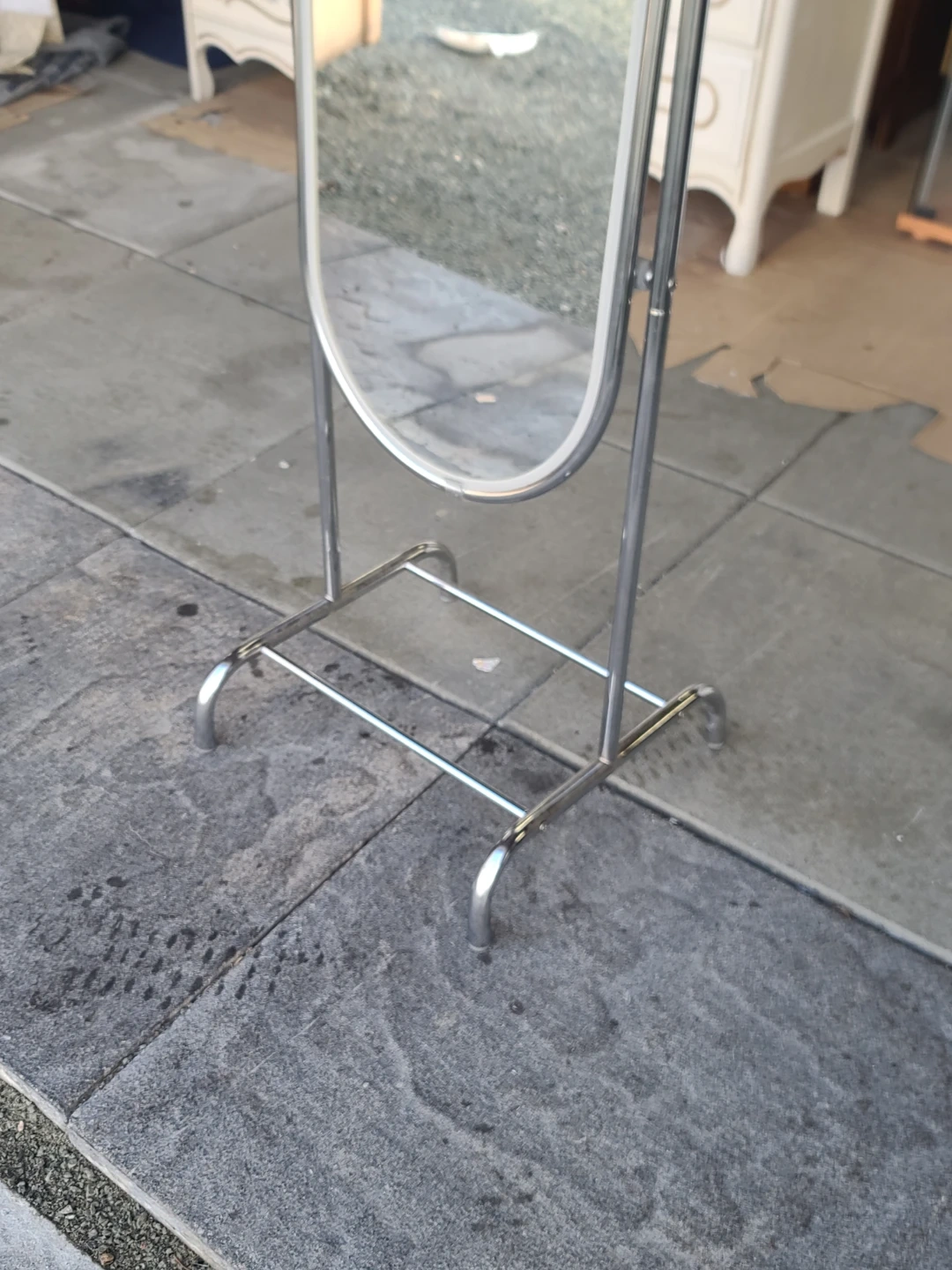 Standing oval mirror with a chrome finish. It's in great shape and ready to brighten up any room! The mirror has a sleek, modern look that would fit well in a variety of spaces. Delivery can be arranged. Viewing and pickup by appointment.