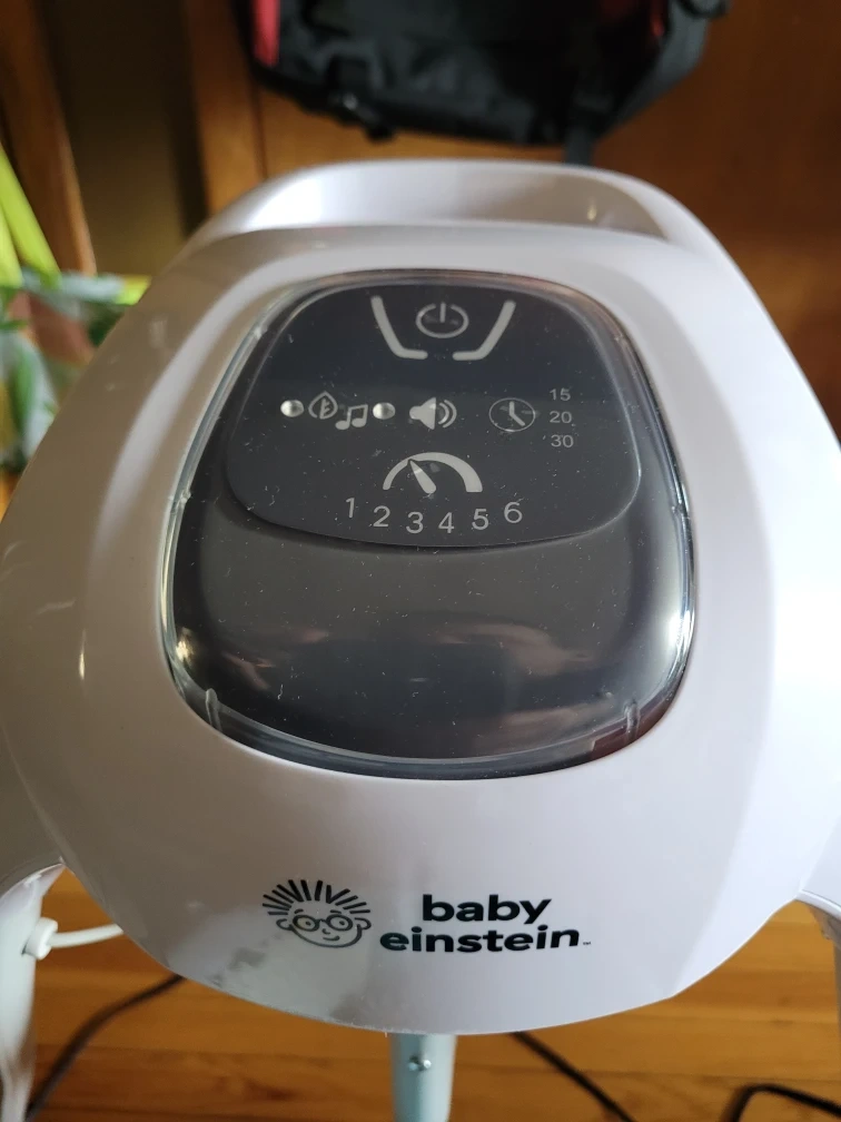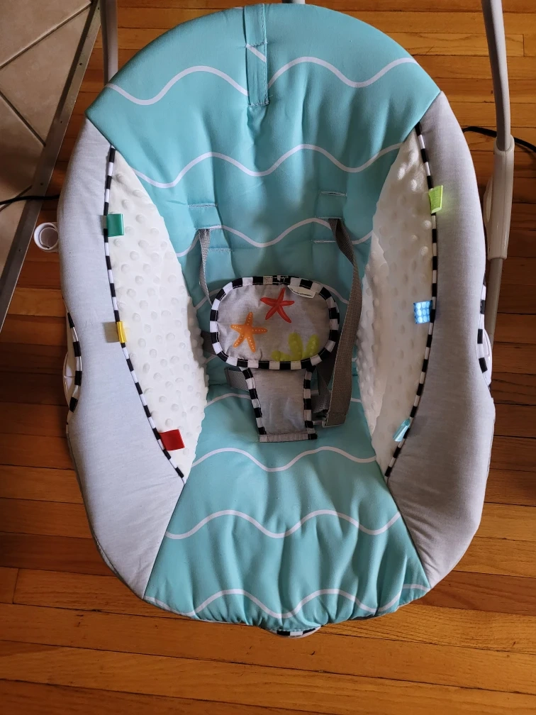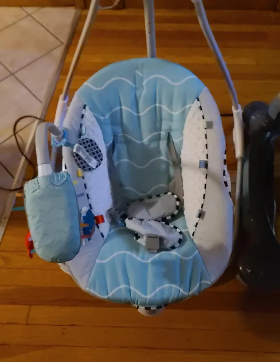 Gently used Baby Einstein swing with a cute ocean wave design. It's in great condition and ready for a new little one! Features a comfortable seat with a safety harness, and a mobile with toys to keep your baby entertained. The swing has different speed settings and plays soothing music and sounds.