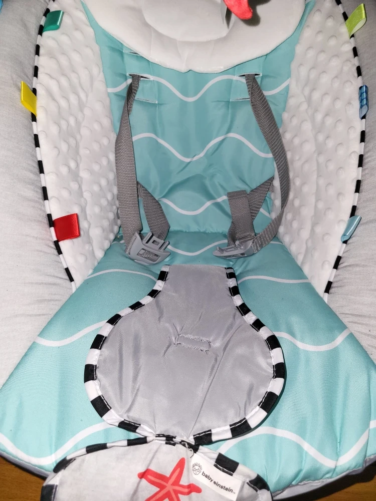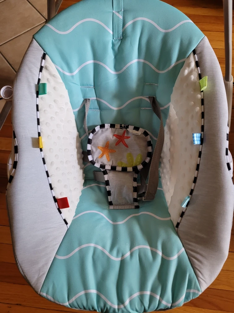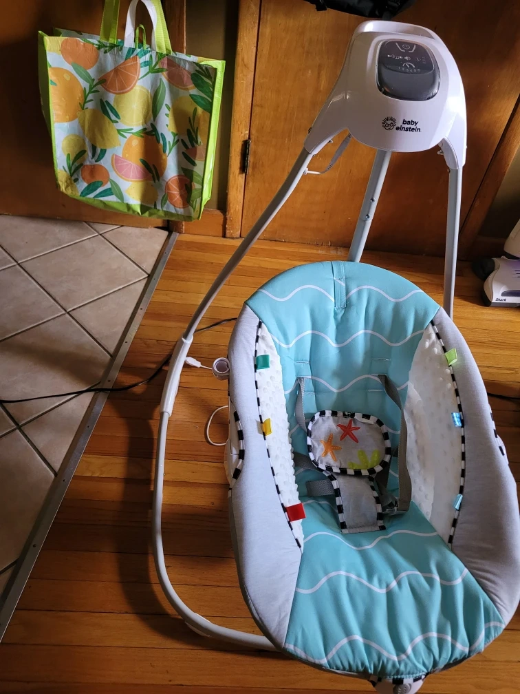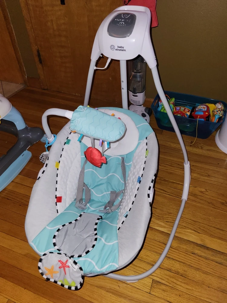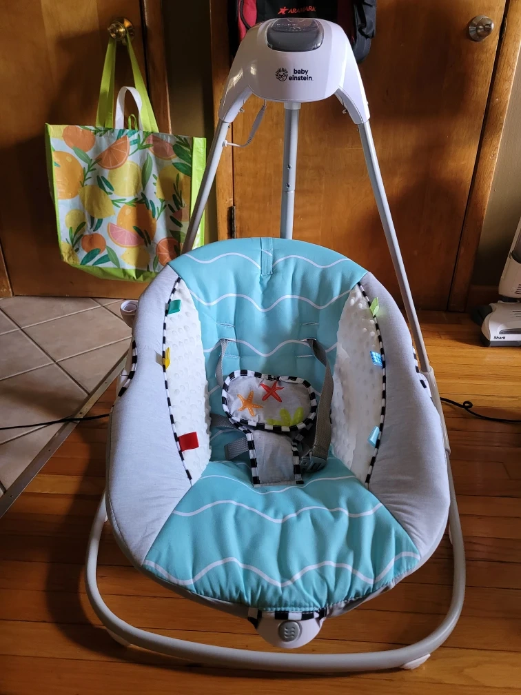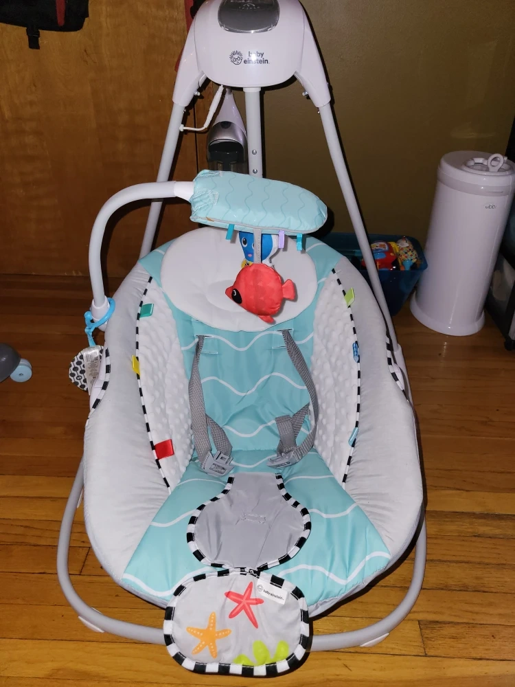 Gently used Baby Einstein swing with a cute ocean wave design. It's in great condition and ready for a new little one! Features a comfortable seat with a safety harness, and a mobile with toys to keep your baby entertained. The swing has different speed settings and plays soothing music and sounds.