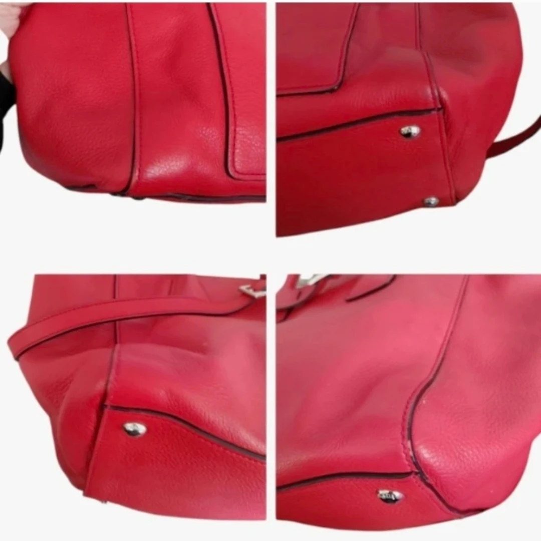 Features: Silver tone hardware. Snap closure. Adjustable leather long strap with double leather handles. Fully lined with 2 large zip wall pockets. Bottom footings. Exterior front zip pocket compartment. Genuine Leather.