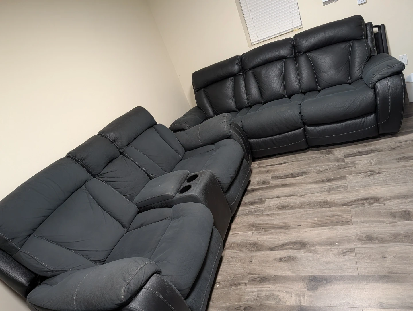 Selling a black leather reclining sectional sofa. It's in good condition and super comfy for movie nights or just relaxing after a long day. This sectional features reclining seats for ultimate comfort and a sleek design that fits well in any living room. Perfect for families or anyone who loves to lounge!