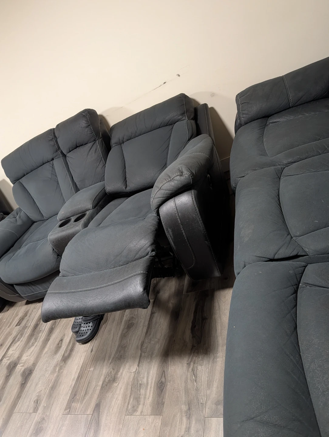 Selling a black leather reclining sectional sofa. It's in good condition and super comfy for movie nights or just relaxing after a long day. This sectional features reclining seats for ultimate comfort and a sleek design that fits well in any living room. Perfect for families or anyone who loves to lounge!