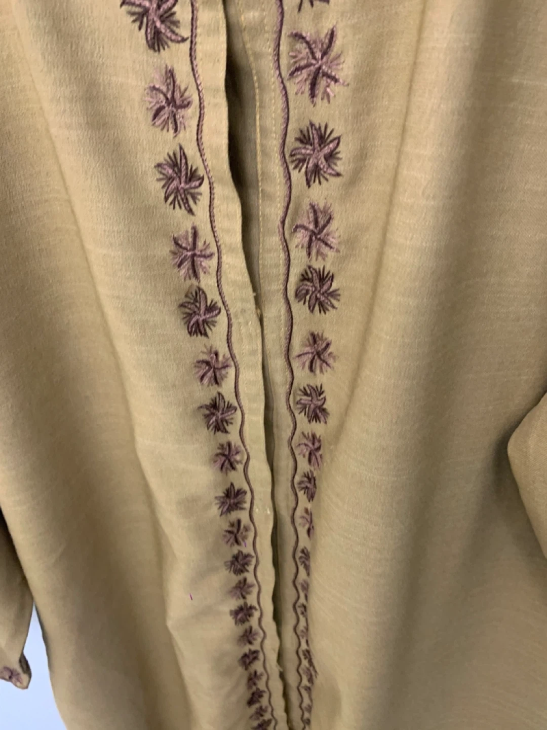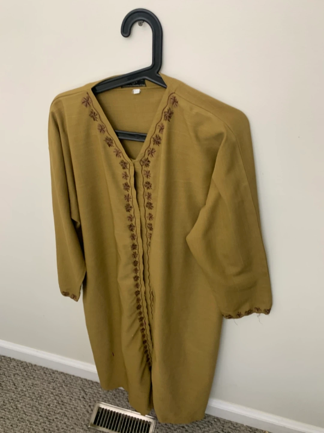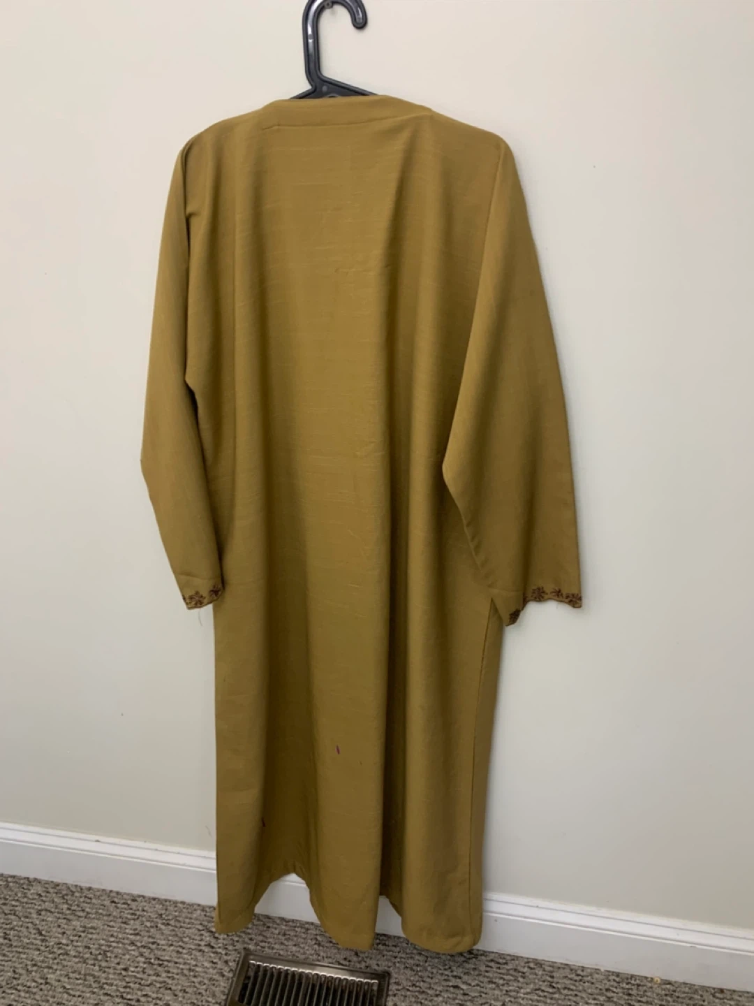 Selling a gently used embroidered thobe in a lovely mustard yellow colour. It features intricate embroidery around the neckline and down the front. Perfect for adding a touch of cultural flair to your wardrobe!