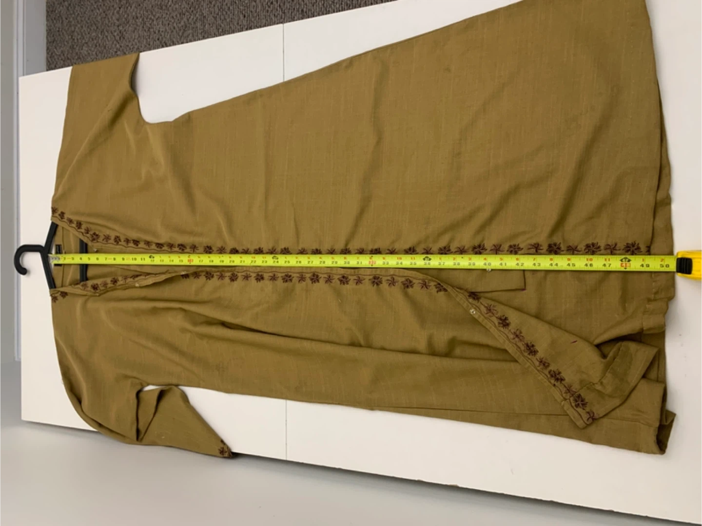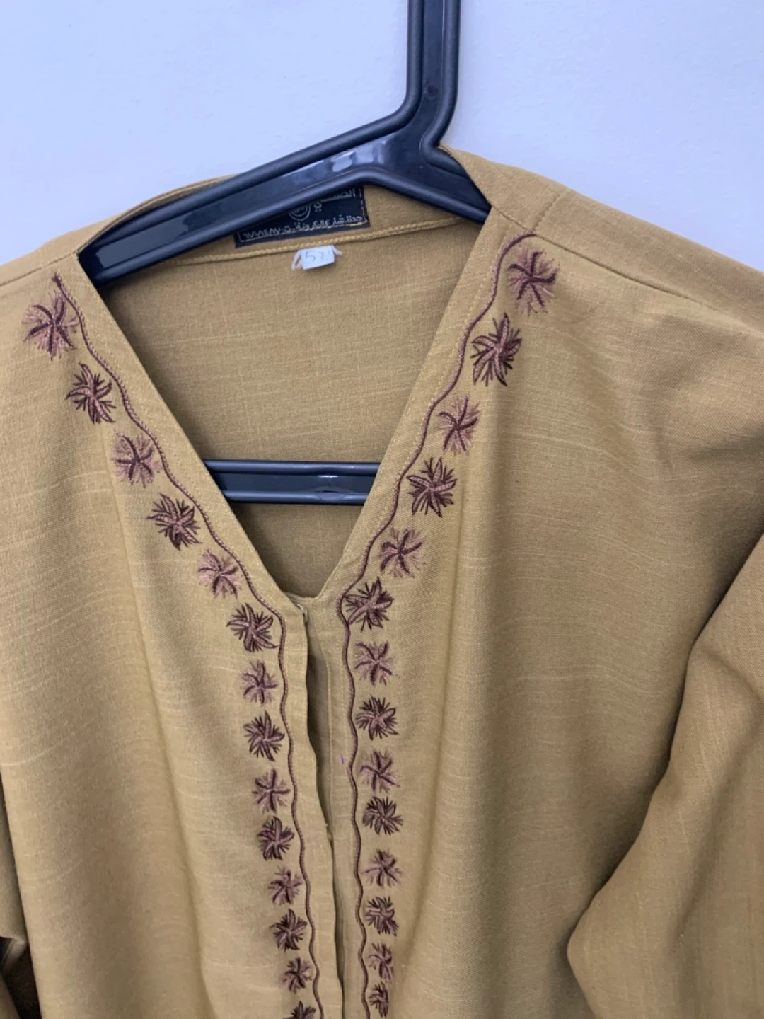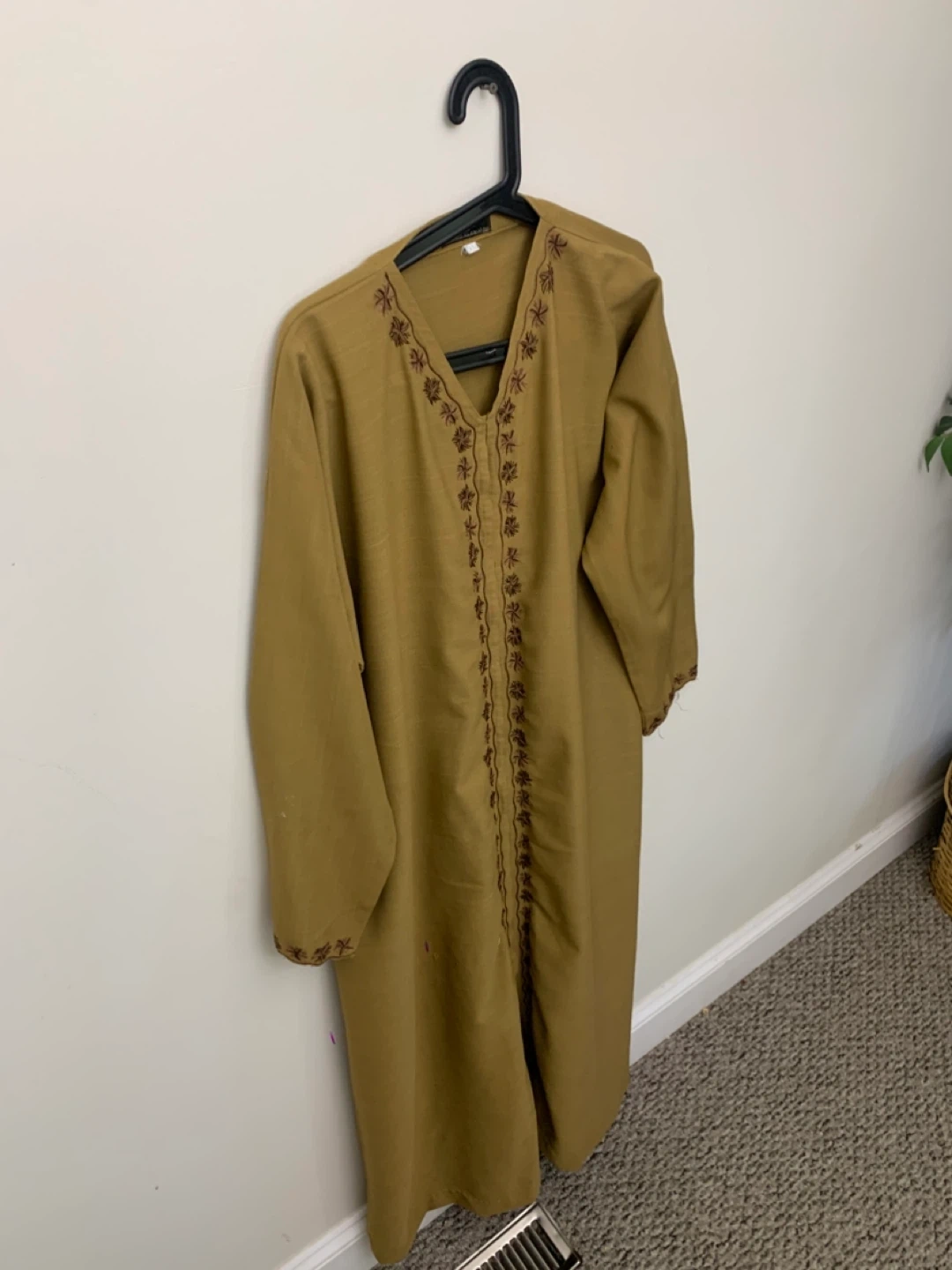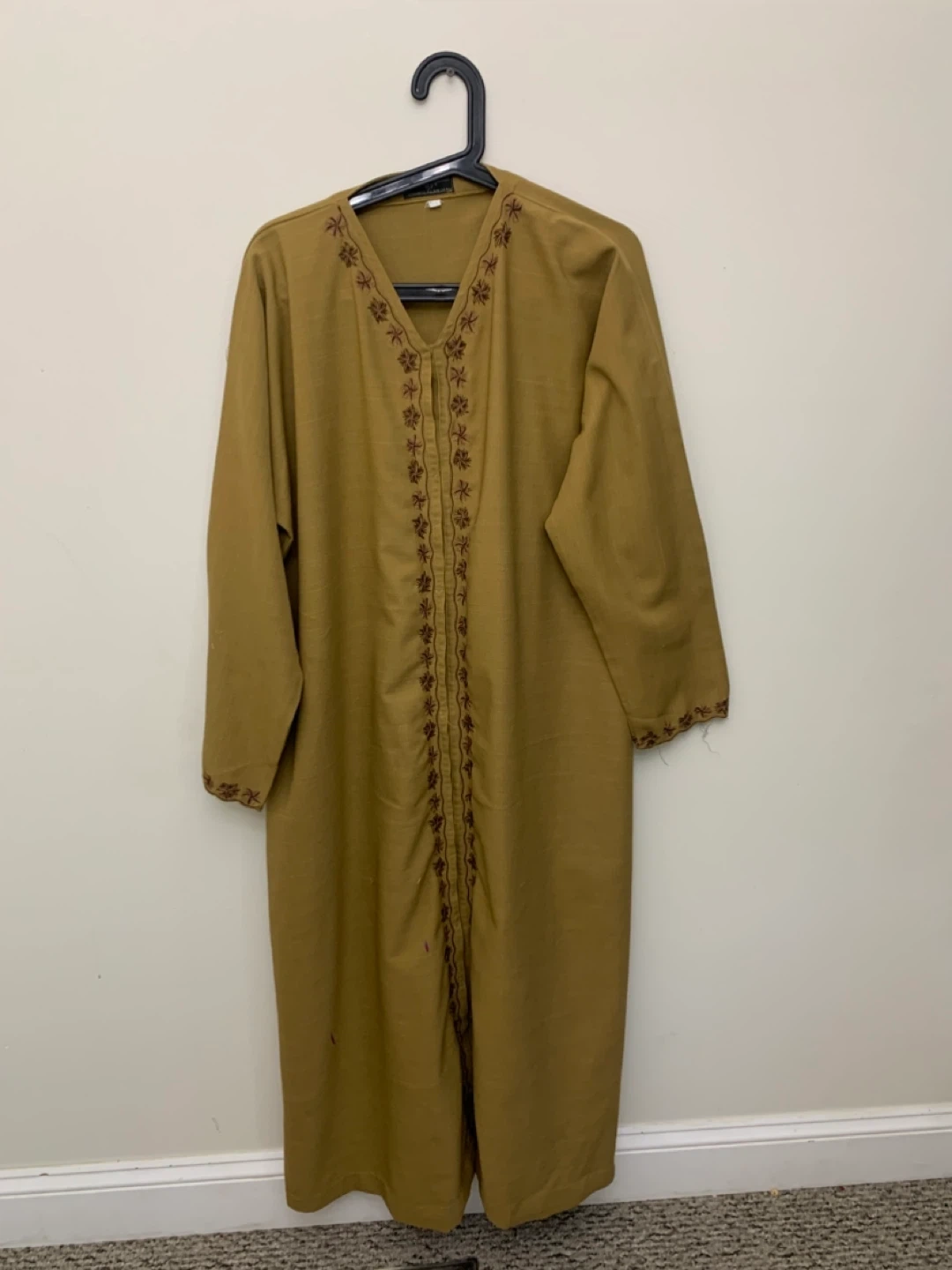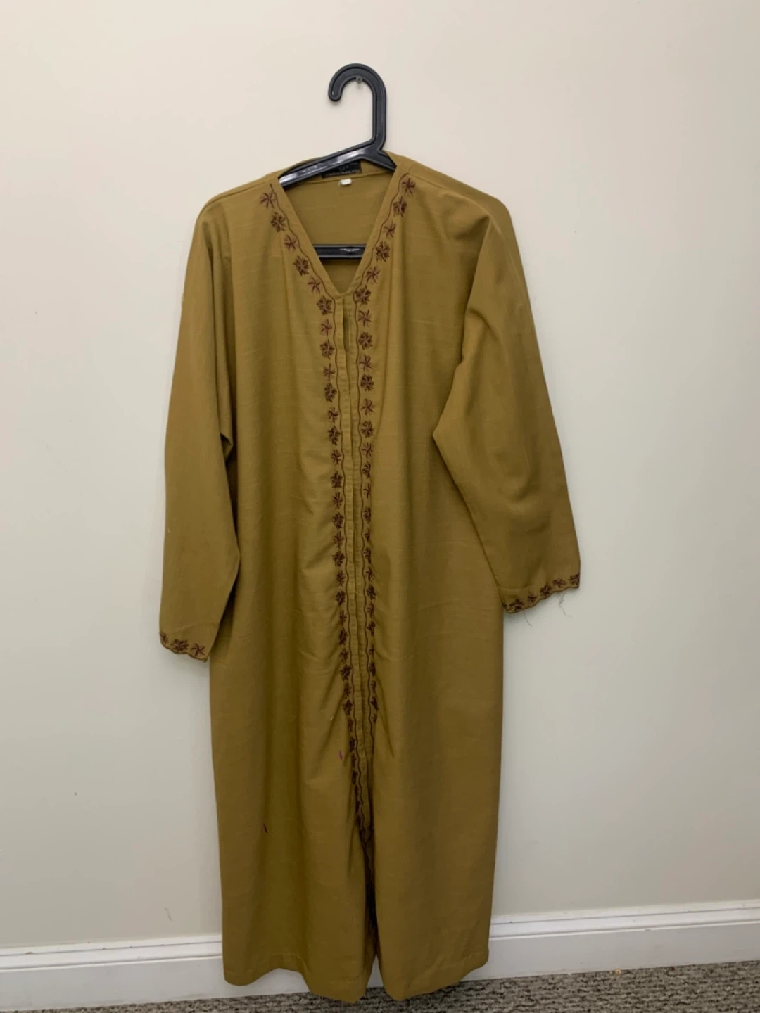 Selling a gently used embroidered thobe in a lovely mustard yellow colour. It features intricate embroidery around the neckline and down the front. Perfect for adding a touch of cultural flair to your wardrobe!