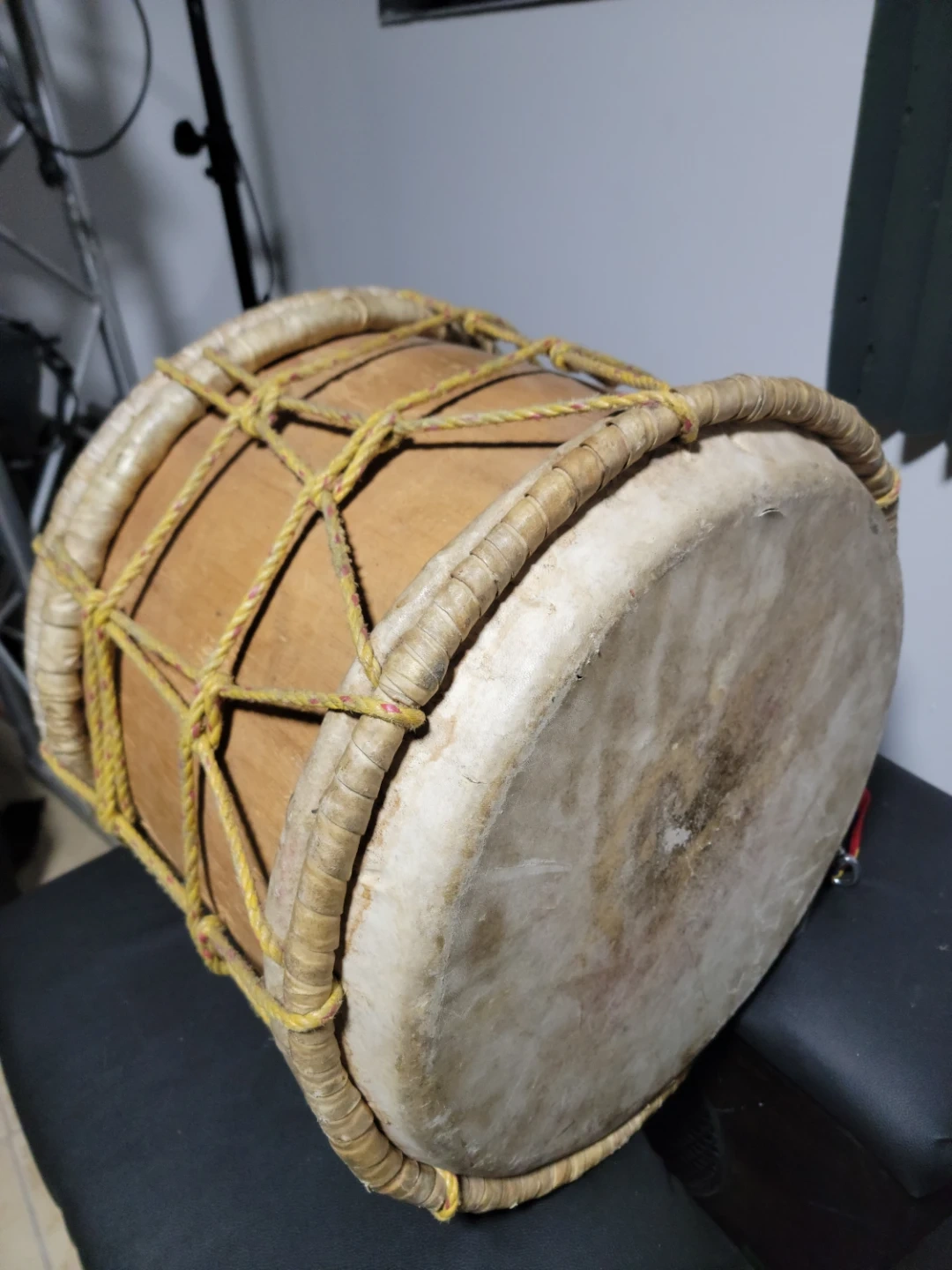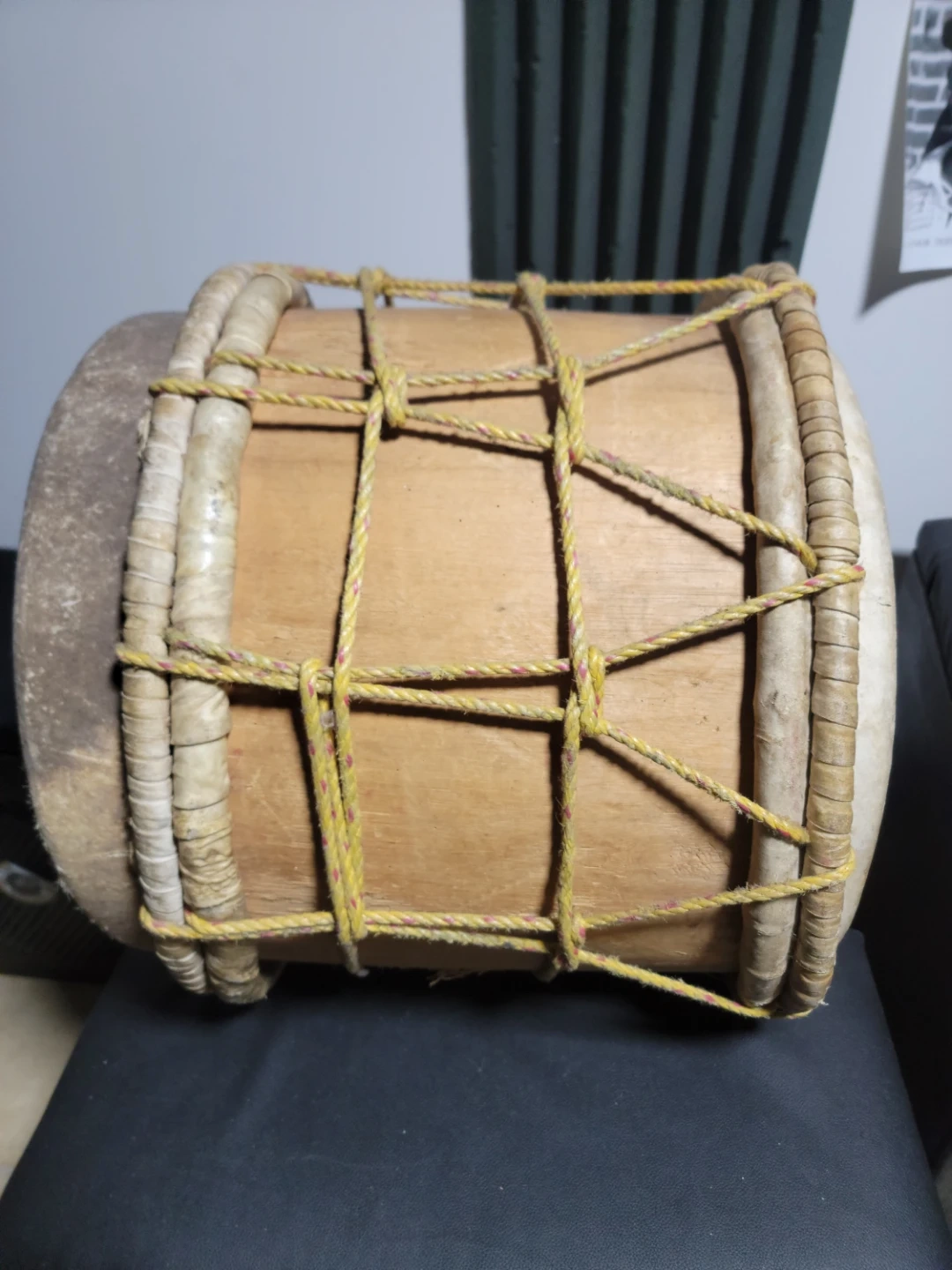 Selling a handmade wooden djembe drum. It has a unique design with rope detailing. Great for musicians or anyone who appreciates handcrafted instruments