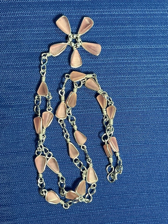 Add a touch of elegance to any outfit with this charming pink stone flower necklace. The necklace is in good condition and features a delicate silver tone chain, complemented by a flower pendant made of smooth, pink stones. A unique and eye-catching piece that would make a lovely addition to your jewellery collection! Every day is a chance to shine! If the ad is up, it's still available!