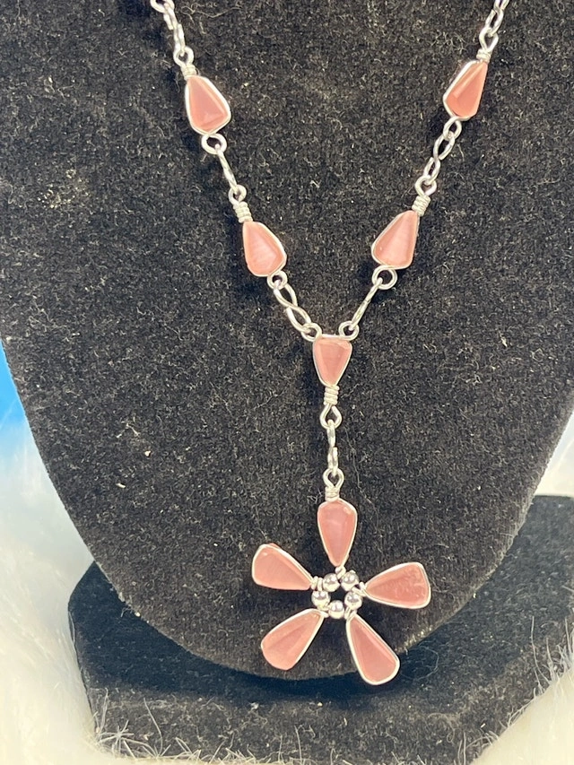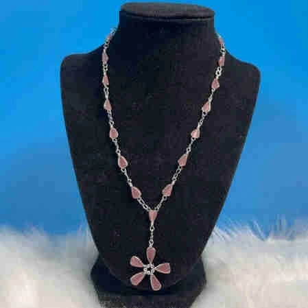 Add a touch of elegance to any outfit with this charming pink stone flower necklace. The necklace is in good condition and features a delicate silver tone chain, complemented by a flower pendant made of smooth, pink stones. A unique and eye-catching piece that would make a lovely addition to your jewellery collection! Every day is a chance to shine! If the ad is up, it's still available!