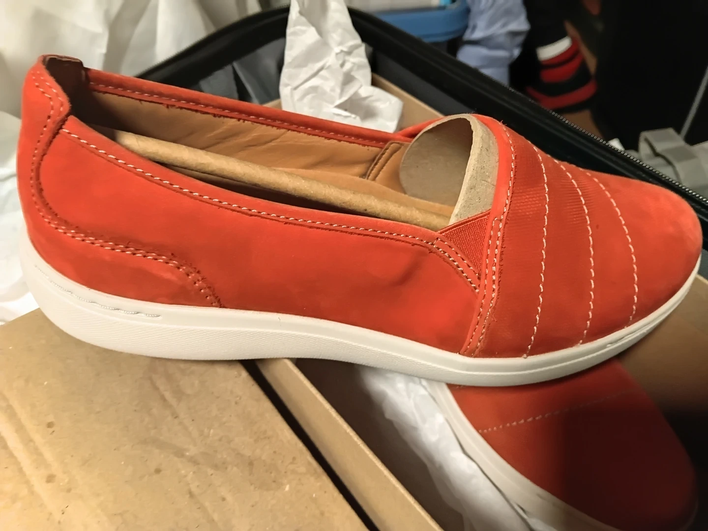 Selling a pair of Clarks slip-on shoes in a vibrant orange colour! They come with the original box. Perfect for adding a pop of colour to your outfit and super comfy for everyday wear