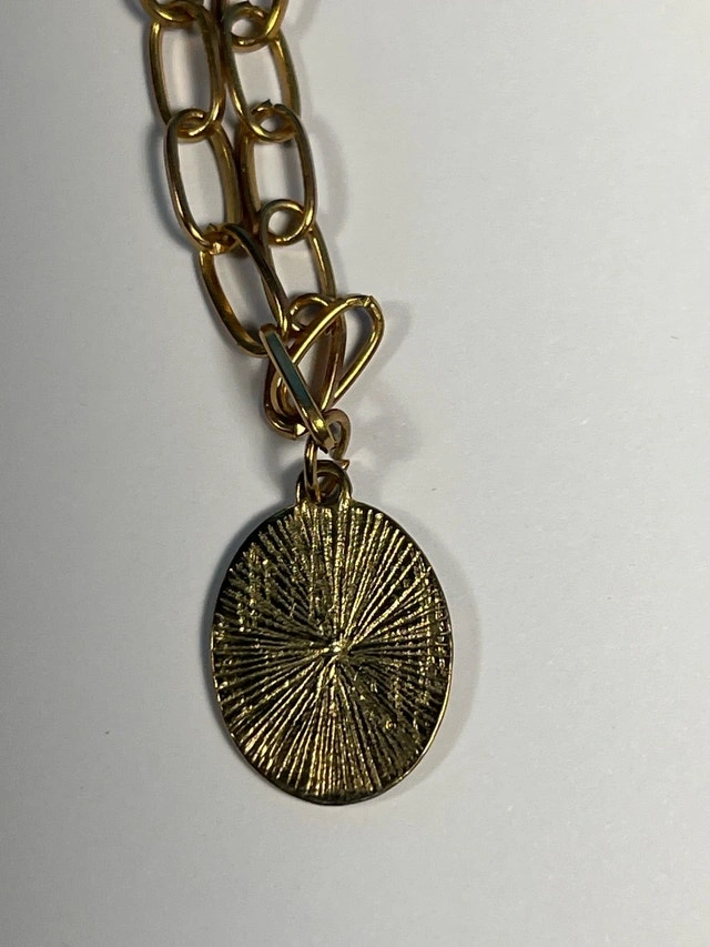 This is a used necklace with a gold tone chain and a pendant featuring a colourful flower design. It's in good condition and adds a charming touch to any outfit. * Gold tone chain * Flower pendant Add a little sparkle to your day; after all, every day is better with a little flower power. If the ad is up, it's available!