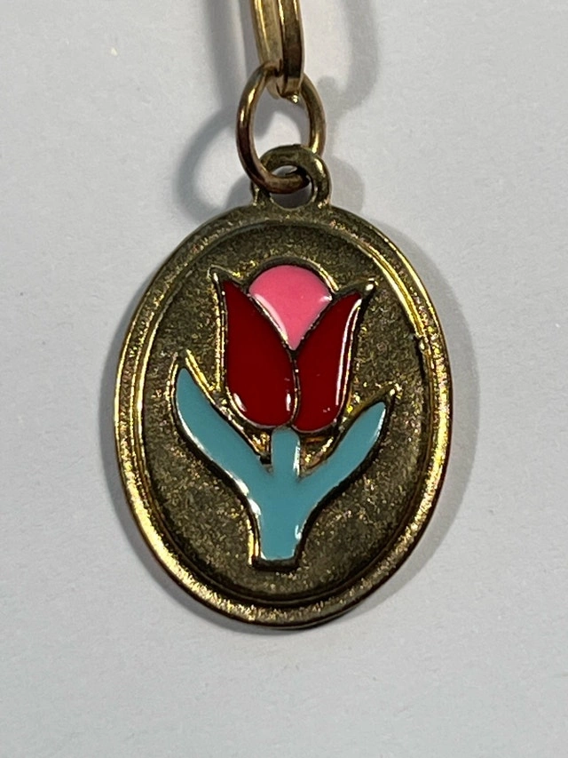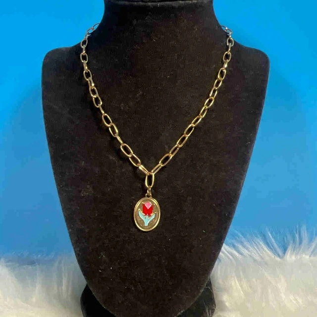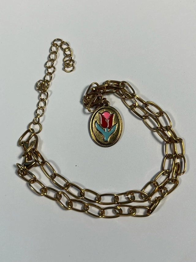 This is a used necklace with a gold tone chain and a pendant featuring a colourful flower design. It's in good condition and adds a charming touch to any outfit. * Gold tone chain * Flower pendant Add a little sparkle to your day; after all, every day is better with a little flower power. If the ad is up, it's available!