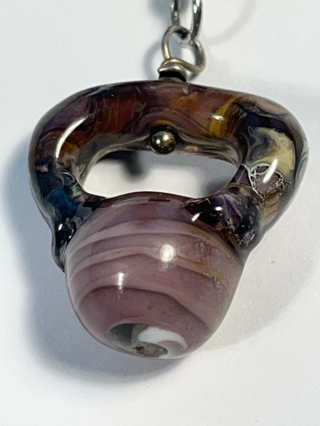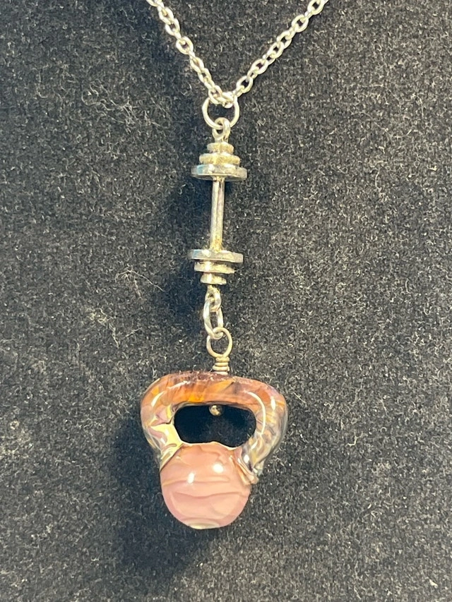 I'm selling a unique handmade necklace featuring a kettlebell and dumbbell design, perfect for fitness enthusiasts. The glass kettlebell pendant has a swirl of purple and brown, while the dumbbell is silver-toned. This necklace is in used condition. Let me know if you're interested!