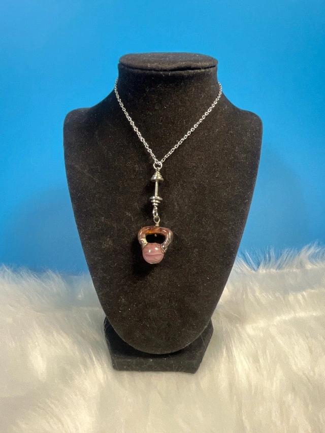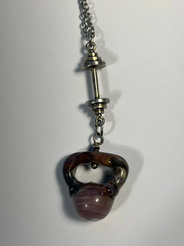 I'm selling a unique handmade necklace featuring a kettlebell and dumbbell design, perfect for fitness enthusiasts. The glass kettlebell pendant has a swirl of purple and brown, while the dumbbell is silver-toned. This necklace is in used condition. Let me know if you're interested!