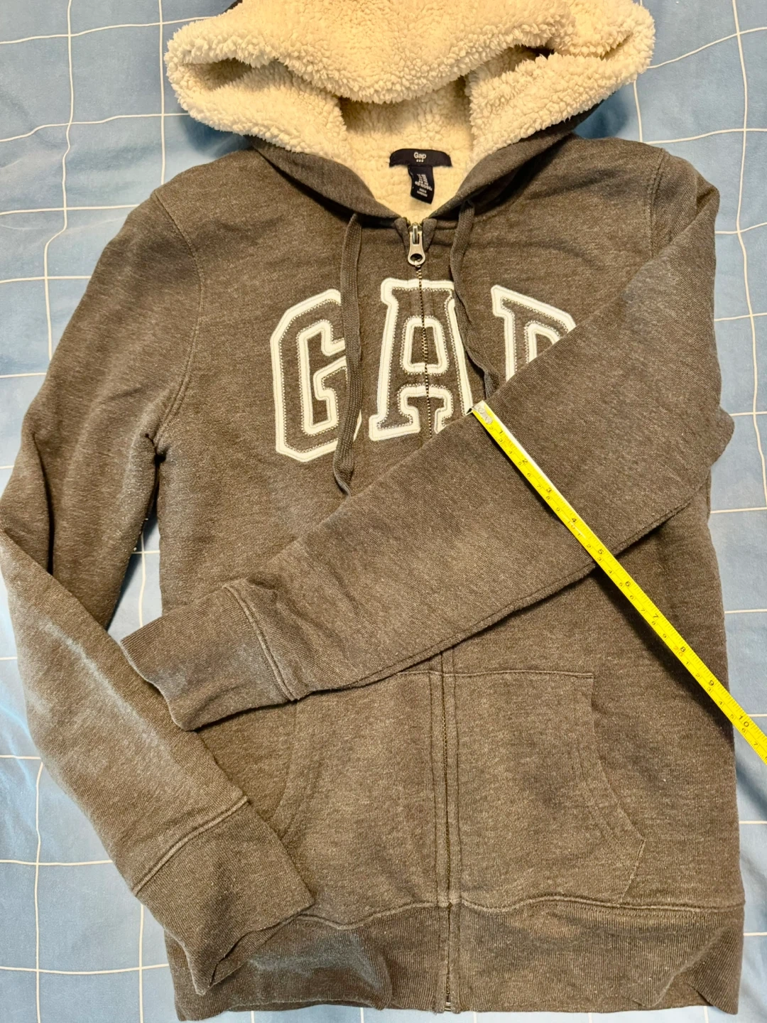 Cozy GAP hoodie with a sherpa-lined hood! It's grey and features the GAP logo on the front. Perfect for staying warm and comfy.